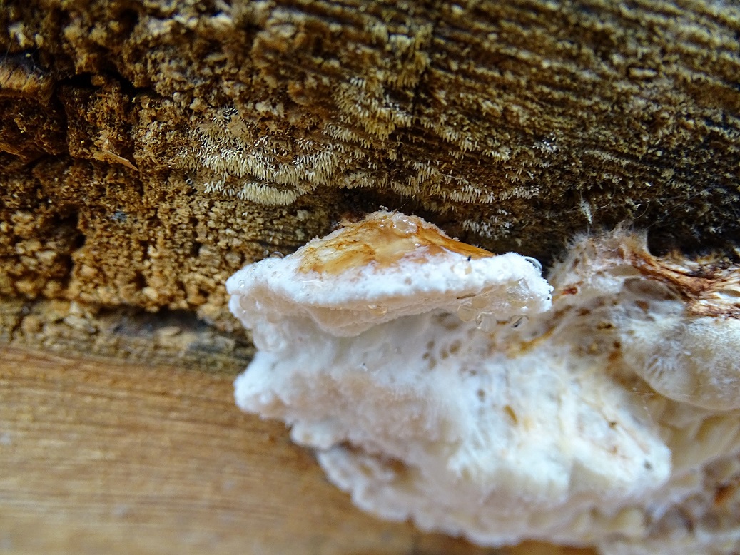 Reinlinsen müsste man schon (nicht nur in den Porling sondern auch in die Mucronella und die vermutete Coniophora, wenn man die bestimmen wollte), aber beim Porling würde ich schon einige Chips setzen, daß da nichts anderes raus kommt. Der ist im Gegensatz zu Antrodia serialis weich, fast schwabbelig, (siehe auch die klaren Tropfen am Pilz), im Kontext mit komplett gelifizierten Zonen, so daß du da regelrecht Wasser rausdrücken kannst. Im Alter in allen Teilen mehr und mehr goldorange bis rostrot verfärbend und getrocknet hornartig brüchig.
