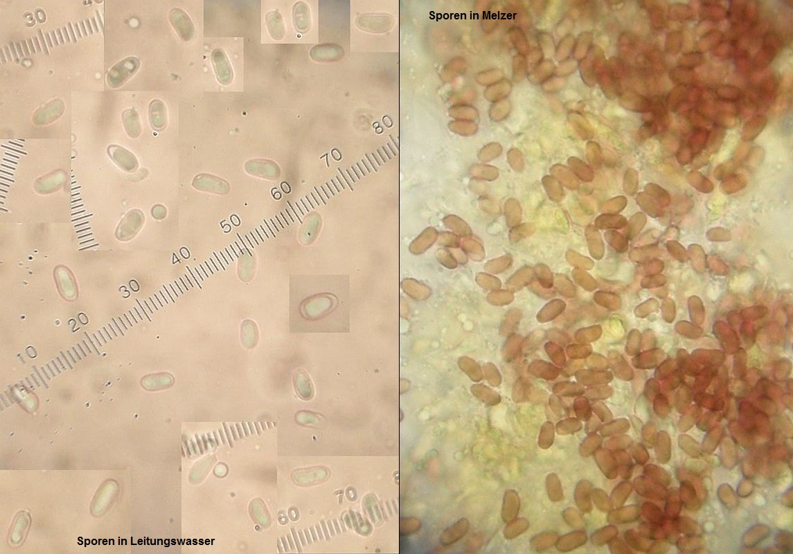 mikroskopische Eigenschaften: Hyphenstruktur monomitisch, Septen mit Schnallen, Hyphen überwiegend dünnwandig, teilweise gelifiziert, gefüllt mit reichlich öligem Inhalt entweder als feine, dichte Tröpfchen aber auch zu größeren Blasen zusammenfließend; Basidien keulig, eher schlank mit (2-) 4 Sterigmen und Basalschnalle, Zystiden fehlen, gelegentliche Hyphidien überragen die Basidien kaum; Sporen +/- zylindrisch (manche mehr ellipsoid), könnte man als –žtönnchenförmig–œ bezeichnen, teilweise mit einer konkaven Seite, vital gerne mit einem großen Tropfen, der fast die ganze Spore ausfüllt, um 4-6 x 2-3 µm (eigene Messungen); in Melzer stark dextrinoid.