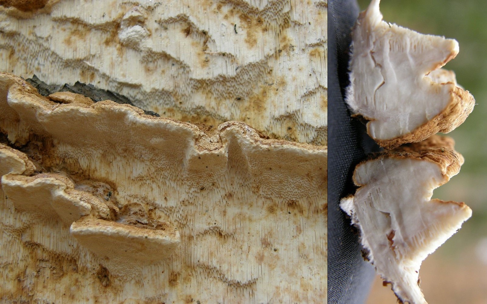makroskopische Eigenschaften: Fruchtkörper normalerweise großflächig, resupinat bis effus-reflex mit +/- gut ausgeprägten Hütchen; diese wenn vorhanden gerne dachziegelig übereinander, auch seitlich zusammenwachsend, bis um die 30mm vom Substrat abstehend, Hutoberseiten blass holzfarben bis braun, grobfilzig bis feinfilzig; Poren weißlich bis blass ockerbräunlich, eckig, an vertikalem Substrat gelegentlich unregelmäßig geschlitzt, ansonsten um 2-4/mm; Röhrenwände normalerweise recht dick und gerade bei jungen Exemplaren ungefähr so dick wie das Lumen der Röhren; frische Fruchtkörper sehr zähelastisch bis fest korkig, getrocknet hart und kaum brüchig.