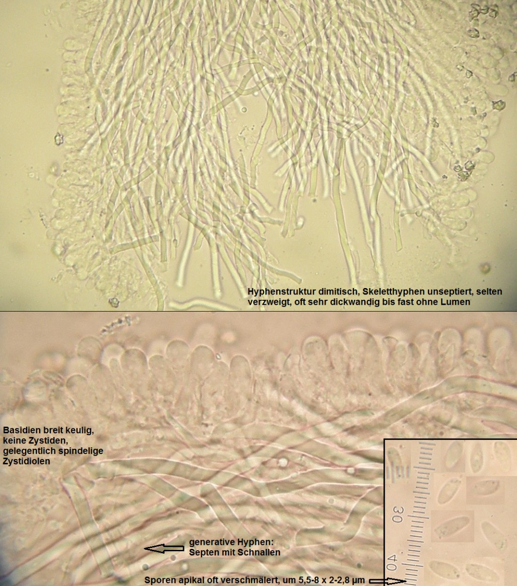 mikroskopische Eigenschaften: Hyphenstruktur dimitisch, Skeletthyphen in Röhren und Kontext sehr häufig, stark dickwandig, manchmal ohne erkennbares Lumen, generative Hyphen mit Schnallen; Basidien überwiegend 4-sporig, mit Basalschnalle, keulig; Zystiden fehlen, spindelige Zystidiolen zahlreich, oft apikal inkrustiert; Sporen inamyloid, glatt, dünnwandig, hyalin, normalerweise zu einem hohen Prozentsatz apikal verschmälert bis zugespitzt und dadurch mit projektilförmiger oder sogar spindeliger Optik, um 6-8 (lt. Lit. auch bis 10) x 2-3 µm.