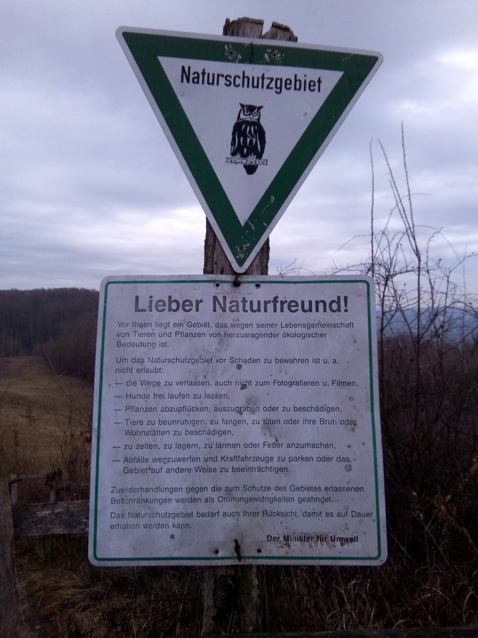 Blabla, blubber, ein Schild das lediglich sein Gewicht an Blech wert ist. Was zum Geier soll da geschützt werden? Die Bäume, die weg sind? Die kleinen Tierchen wie Bilche, die sich nicht mehr hinaus trauen, weil ihnen die Deckung fehlt? Oder die seltenen Pilzarten? Aber wen interessieren Pilze, die gibt's ja im Supermarkt. Vielleicht trage ich auch ein bißchen dick auf, ich würde es nur gerne verstehen.