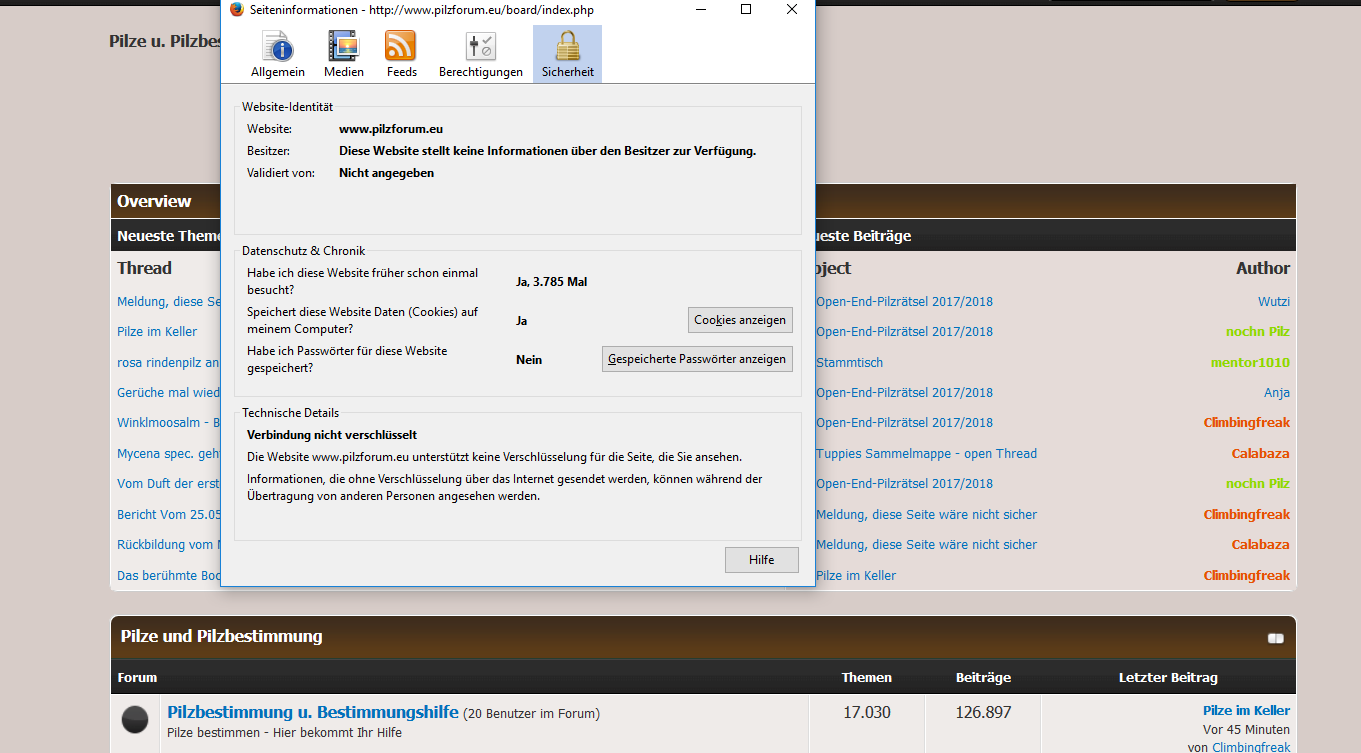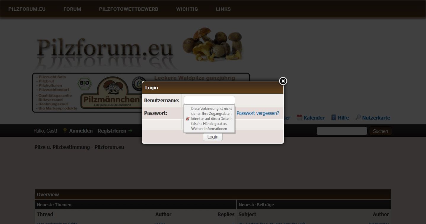 ich melde mich kurz als IT-ler zur Wort. Der Grund für die obige Meldung ist, dass die pilzforum.eu Webseite keine Verschlüsselung über https anbietet. Man kann also nur über http://, nicht aber über https:// darauf zugreifen. Daten, die über http:// übertragen werden, können von dritten Personen mit entsprechenden technischen Sachverstand mitgelesen werden. Wenn man Zugriff auf die "Leitung" (bzw. das WLAN) zwischen euren Computern und dem Pilzforum.eu-Server hat, über die die Daten laufen, dann ist das nicht einmal besonders schwierig, ja fast schon trivial.