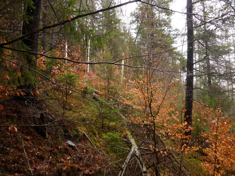 Hier gelungene aber pilzsammlerunfreundliche Naturverjüngung. In Baumlücken säen sich verschiedene Baumarten aus.