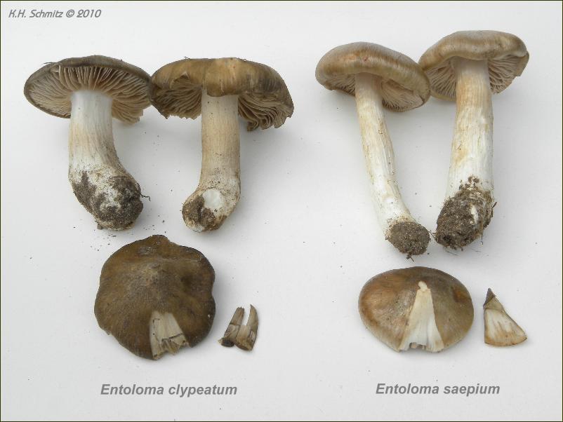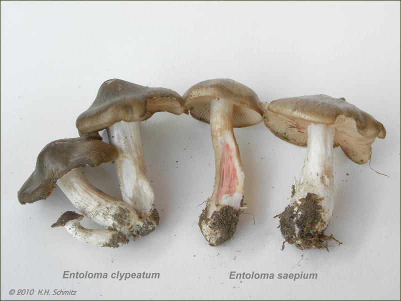 Nur noch eine kleine Ergänzung zu E. saepium. Es gibt laut Gröger da einen ganz einfachen Trick, E. saepium von E. clypeatum zu trennen. Die Trama von E. saepium verfärbt sich mit Anilin rot; bei E. clypeatum nicht. Ansonsten habe ich, zumindest im Gröger, kein gescheites Trennmerkmal finden können. Sporengröße und Form ist laut der dortigen Beschreibung bei beiden Arten sehr ähnlich.