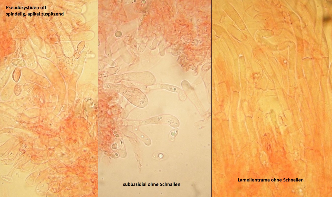 d) Rhodocybe hirneola trotzdem nochmal geprüft: Die Sporenform passt nicht, die Pseudo-Cheilozystiden müssten septiert sein, Fruchtkörper passt irgenwie nicht, Geruch passt wohl nicht, und wie gesagt - er dürfte keine Schnallen haben --> es ist wohl nicht Rhodocybe hirneola.