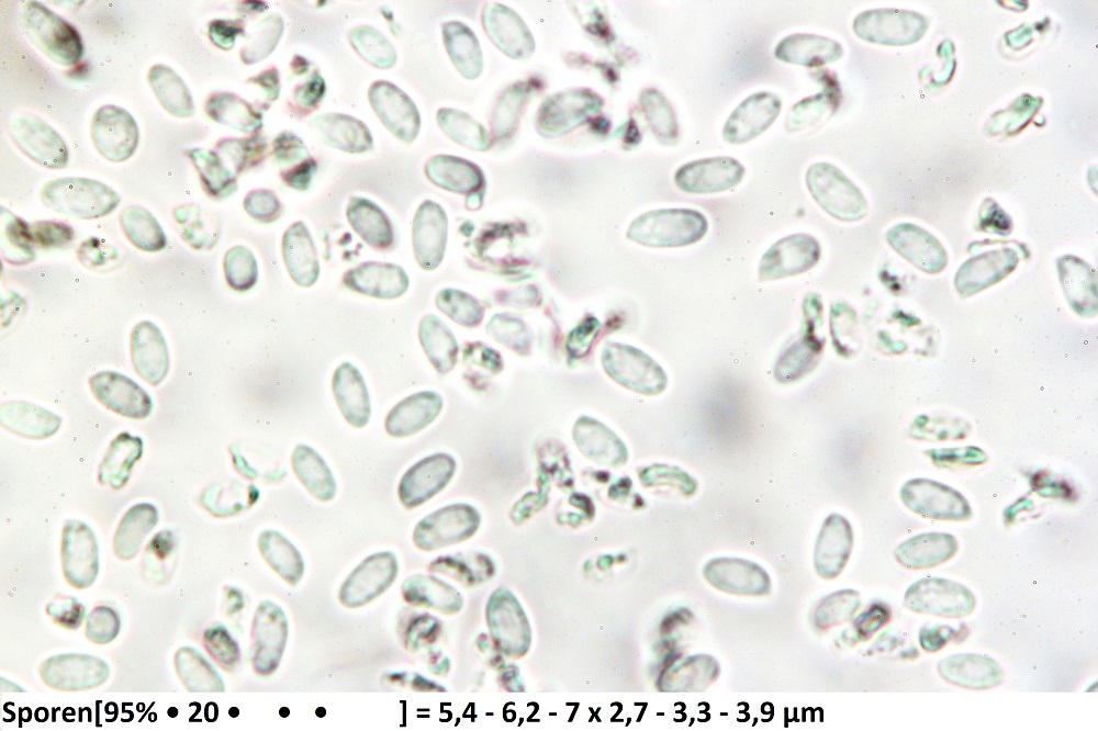 mikroskopische Eigenschaften: Hyphenstruktur monomitisch, Septen überall mit Schnallen; Hyphen im Subikulum parallel zum Substrat, dünn- bis schwach dickwandig, gelegentlich etwas gelifiziert; im Subhymenium dicht verflochten und verklebt, aufsteigend, mit vereinzelten Kristallen durchsetzt, teilweise mit Öltröpfchen; im Hymenium mit spindeligen, zuspitzenden Leptozystiden (dünnwandig, ohne Inkrustierungen); Basidien schlank keulig in dichter Palisade; Sporen elliptisch bis subzylindrisch, glatt, dünnwandig, inamyloid, vital mit refraktärem Inhalt aus teilweise zu größeren Gebilden zusammenfließenden Tropfen; um 4,5-7 x 2,2-3 µm (eigene Messungen)