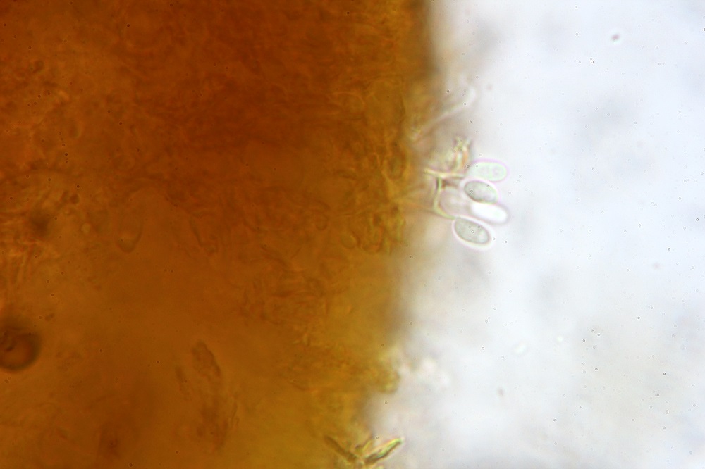 mikroskopische Eigenschaften: Hyphenstruktur monomitisch, Septen überall mit Schnallen; Hyphen im Subikulum parallel zum Substrat, dünn- bis schwach dickwandig, gelegentlich etwas gelifiziert; im Subhymenium dicht verflochten und verklebt, aufsteigend, mit vereinzelten Kristallen durchsetzt, teilweise mit Öltröpfchen; im Hymenium mit spindeligen, zuspitzenden Leptozystiden (dünnwandig, ohne Inkrustierungen); Basidien schlank keulig in dichter Palisade; Sporen elliptisch bis subzylindrisch, glatt, dünnwandig, inamyloid, vital mit refraktärem Inhalt aus teilweise zu größeren Gebilden zusammenfließenden Tropfen; um 4,5-7 x 2,2-3 µm (eigene Messungen)
