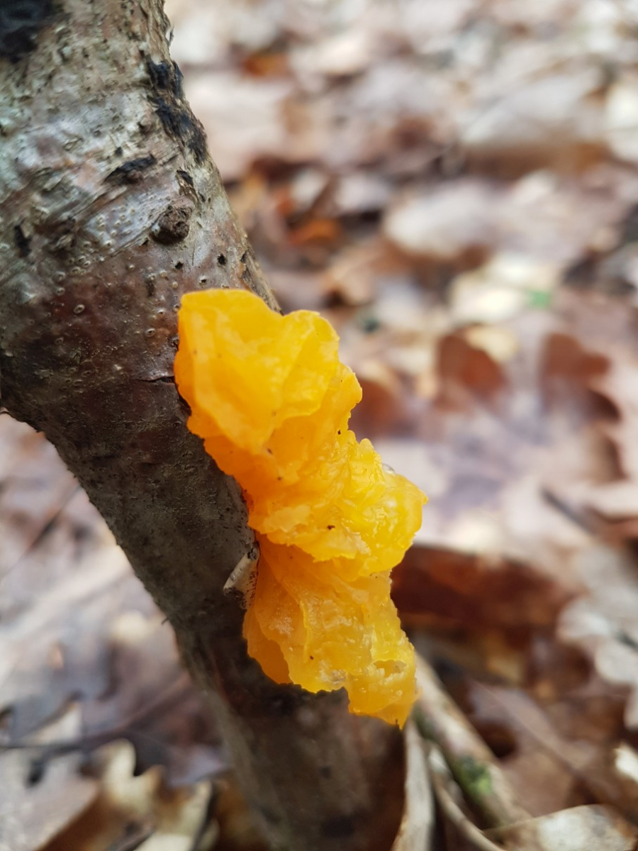 Das Highlight der Tour: Etwas gelbes, glibberiges auf Laubholz-Ast. Ich tippe auf TREMELLA MESENTERICA (Goldgelber Zitterling)