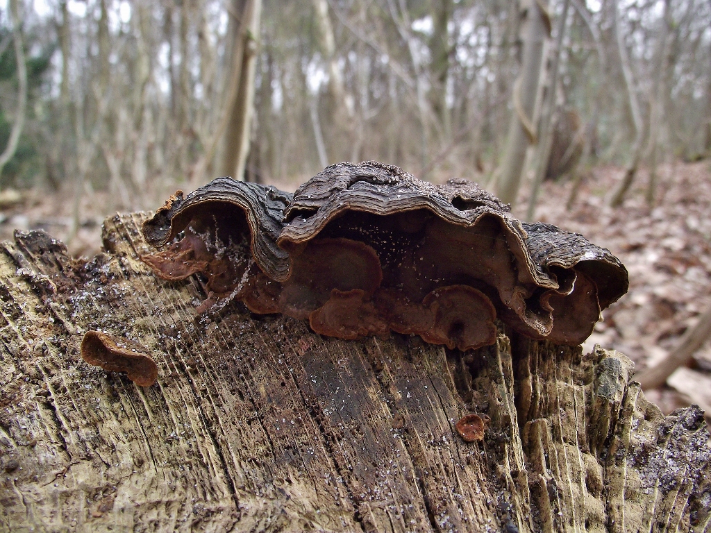 der Umberfarbene Borstenschichtpilz [Hymenochaete rubiginosa]