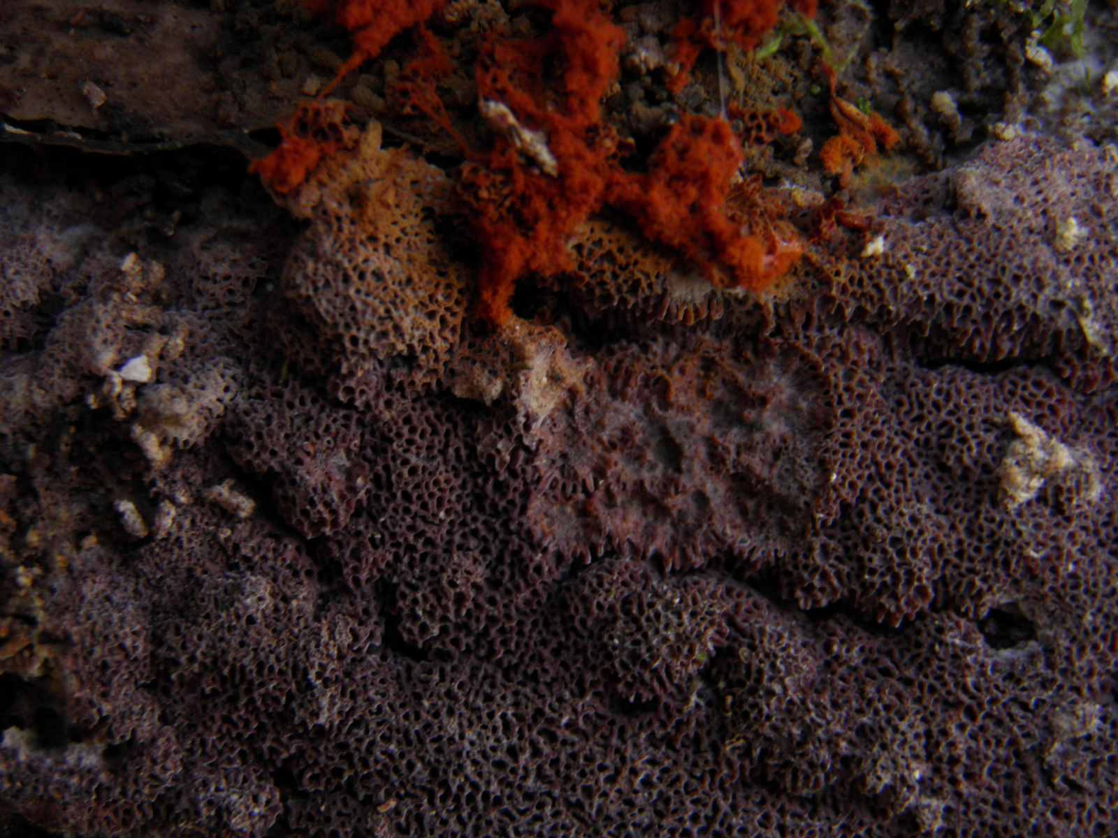 Ein weiterer Punkt ist, dass es so aussieht, als wäre die Struktur direkt bei bzw. sogar unter der Metatrichia intakt. Da dort aber das Plasmodium auf jeden Fall war, wäre die Struktur, sofern der Schleimer sich wirklich von der Ceriporia ernährt hätte, dort auch verschwunden.