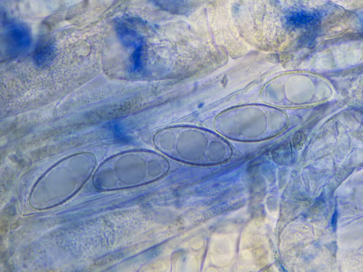 5. Größter Scheibling, frisch, Ascus mit Sporen, 100x, Ausschnitt