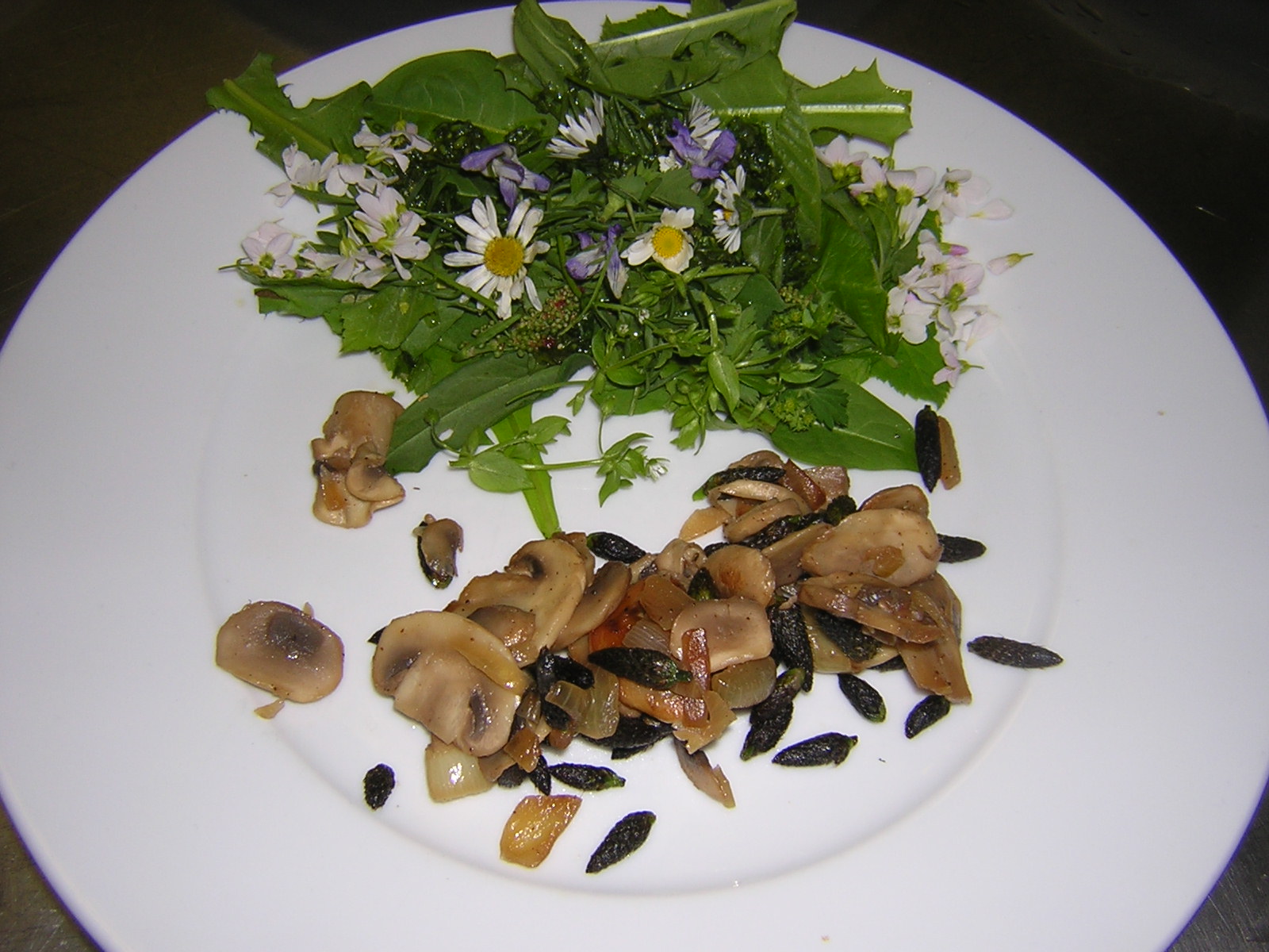Leider habe ich keine weiteren kulinarischen Fotos rein mit Wiesenschaumkraut: Hier ein kleiner Vorspeisenteller mit Wildkräutersalat und der war eben mit Blättern und Blüten des Wiesenschaumkrautes