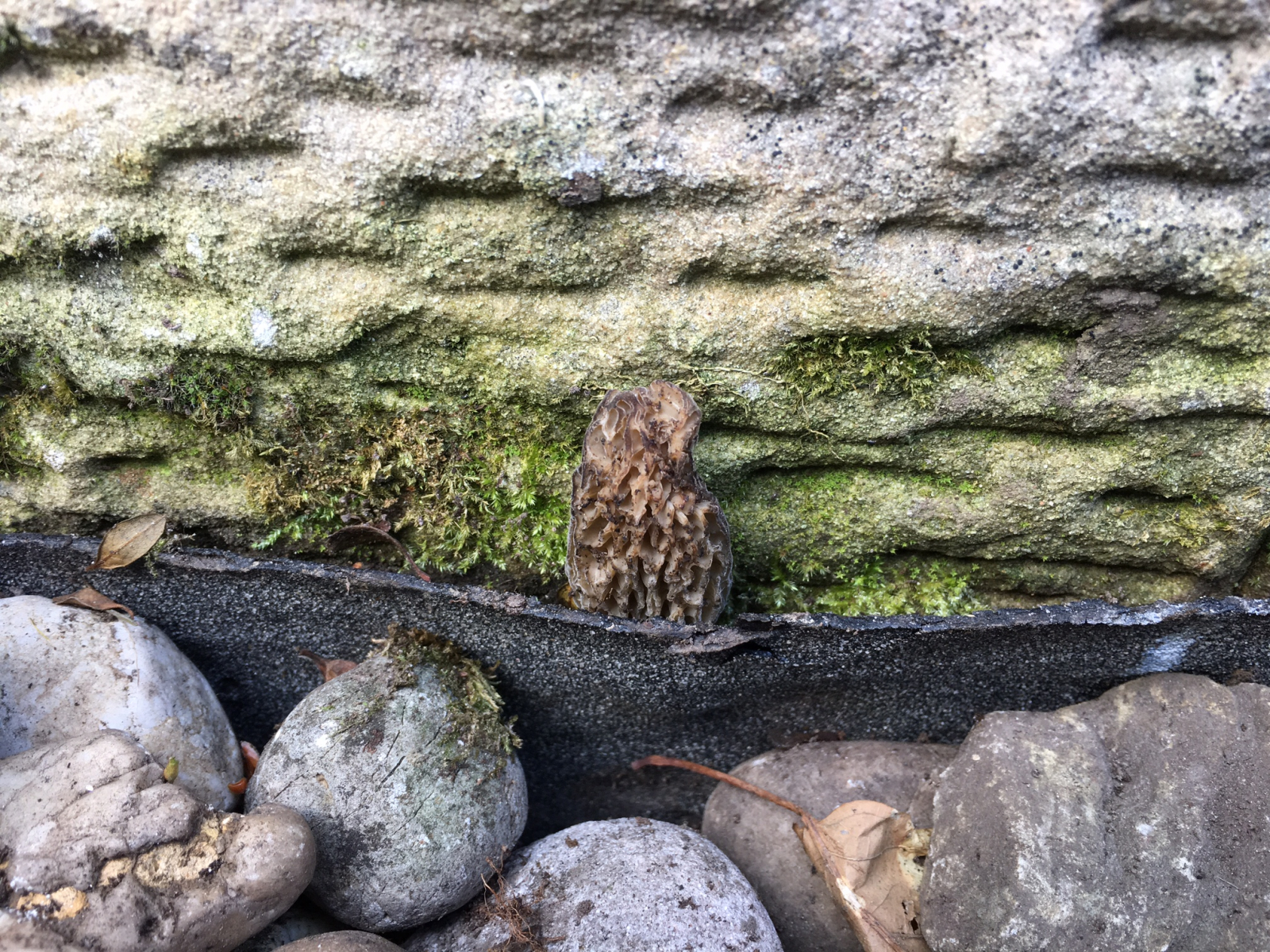 Meinen Vorrednern kann ich mich nur anschließen, ich sehe hier auch (Spitz-) Morcheln, die Deiner Mauer nichts tun!! Morcheln wachsen ja auch gern mal auf Rindenmulch im Garten, nach meiner Beobachtung hat man das Phänomen ein Jahr, dann sind sie wieder verschwunden! Also erfreue Dich an diesem Anblick!! ;)