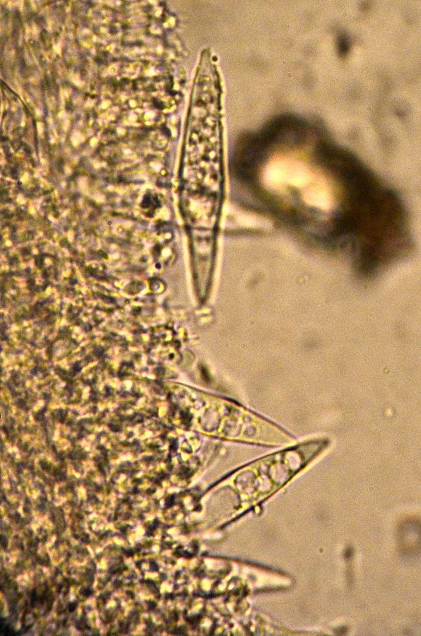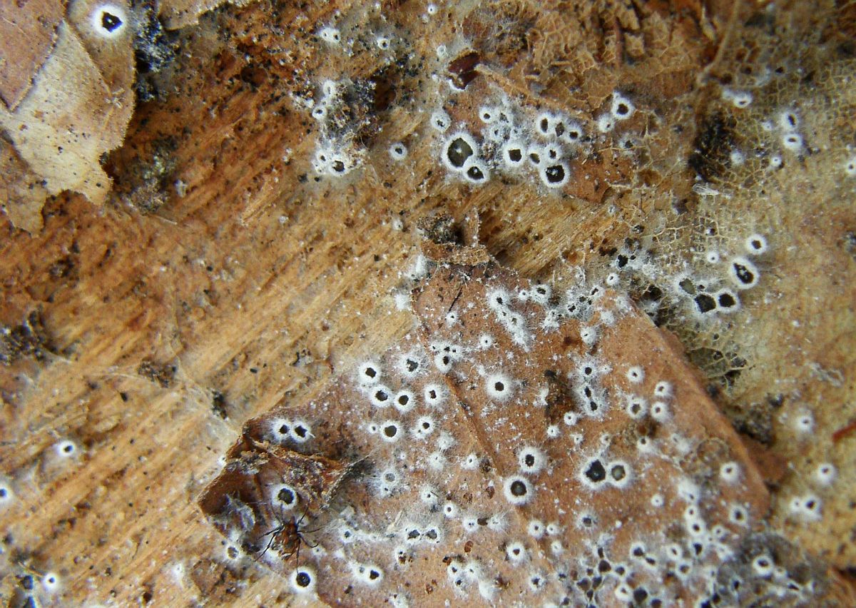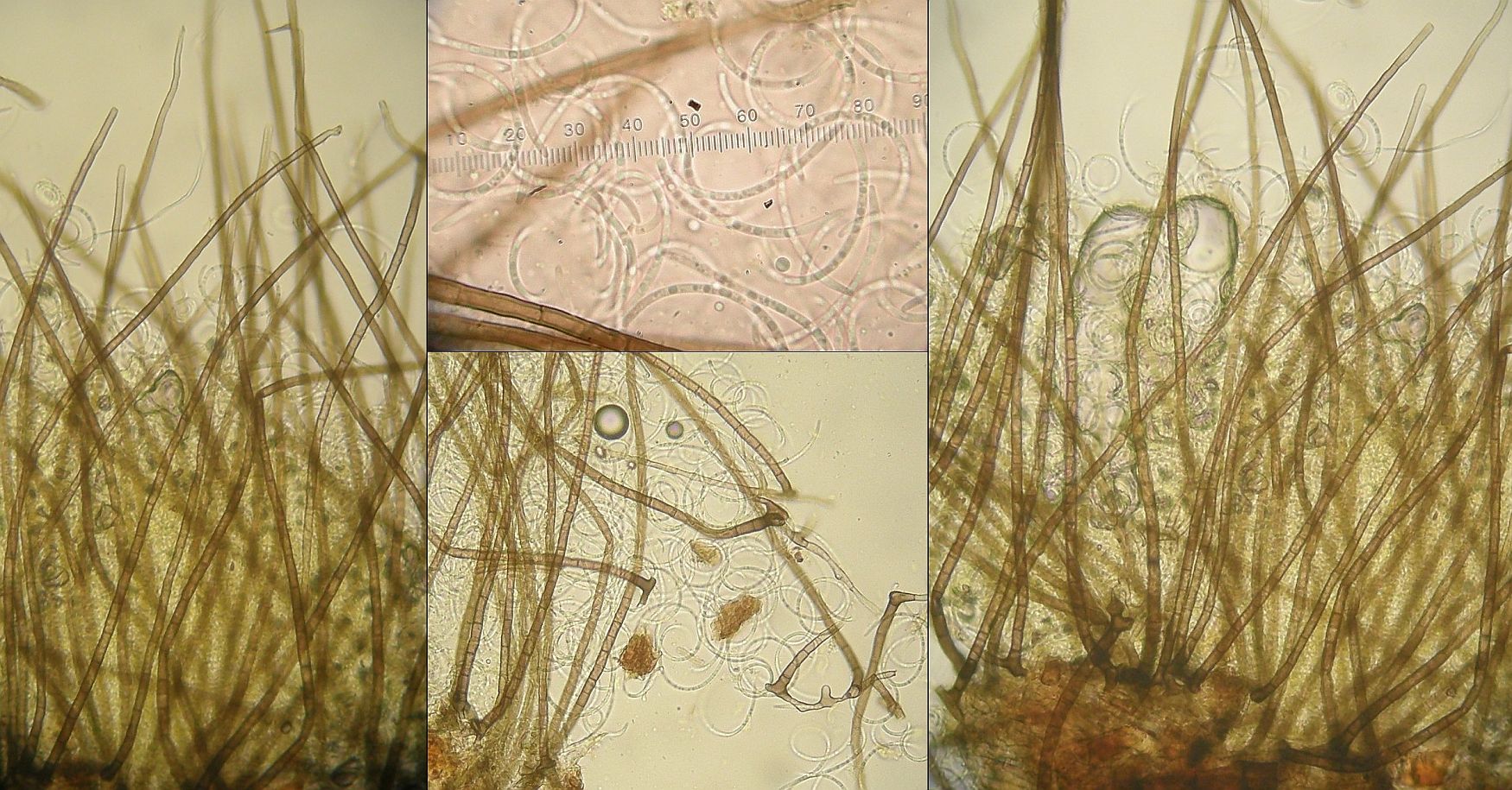Dann gab's noch Anamorphes. Normalerweise nicht so meine Baustelle, aber der sah einfach zu putzig aus. Und dank Hermine weiß ich auch, daß der irgendwie bei Helicosporium eingeordnet werden sollte. Was die Nebenfruchtformen von Tubeufia wären. Verfallene Pyrenos sitzen jedenfalls genug drunter. Also sagen wir mal: Helicosporium cf vegetatum (= Tubeufia cf cerea):