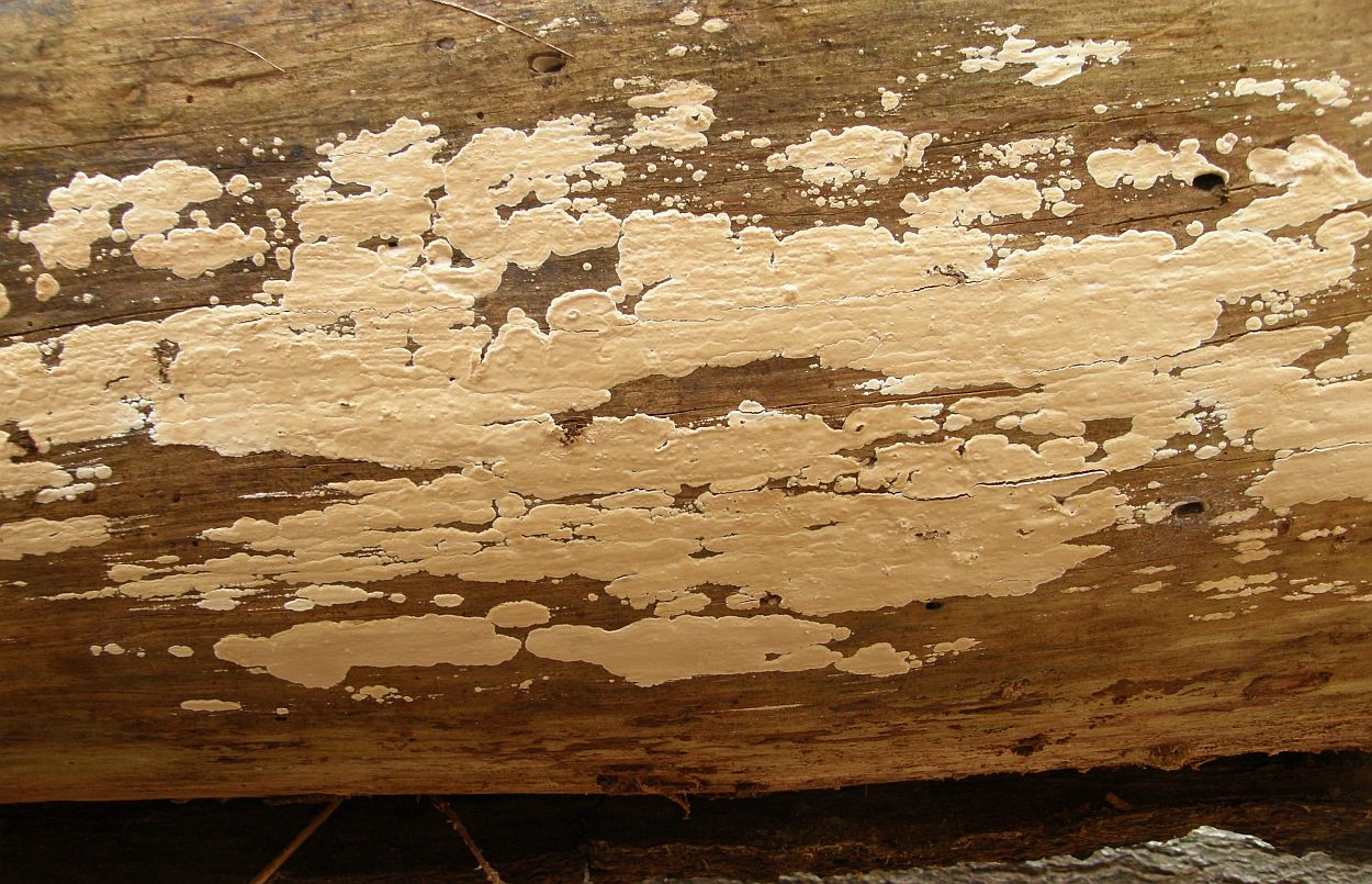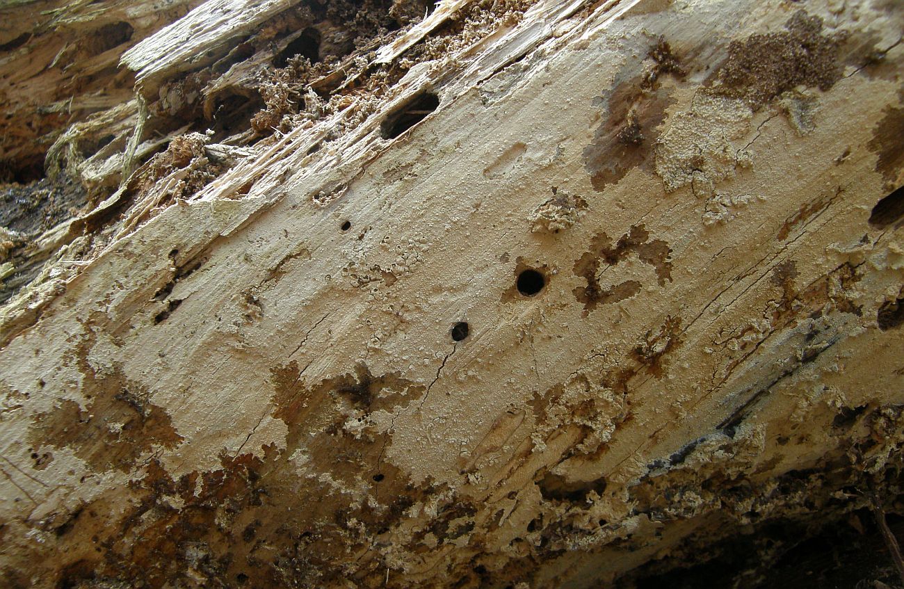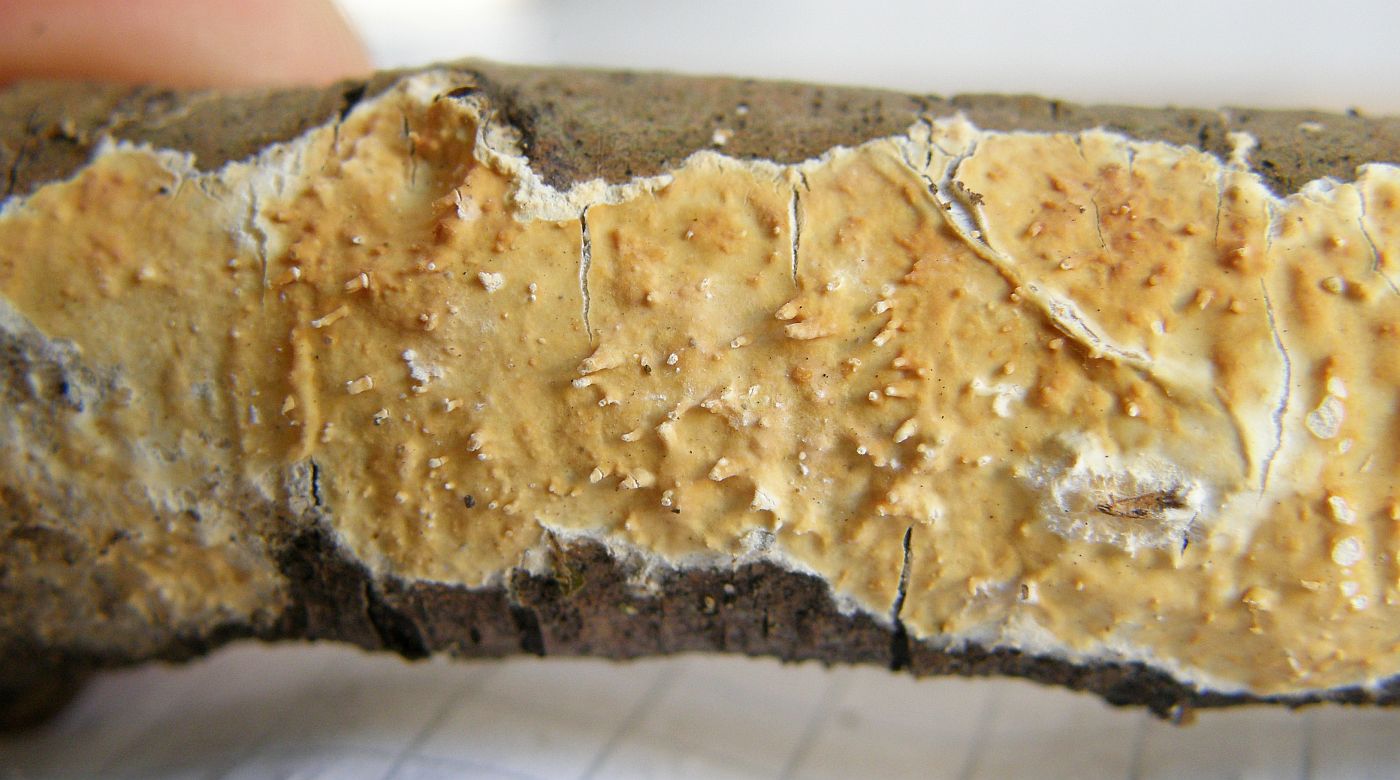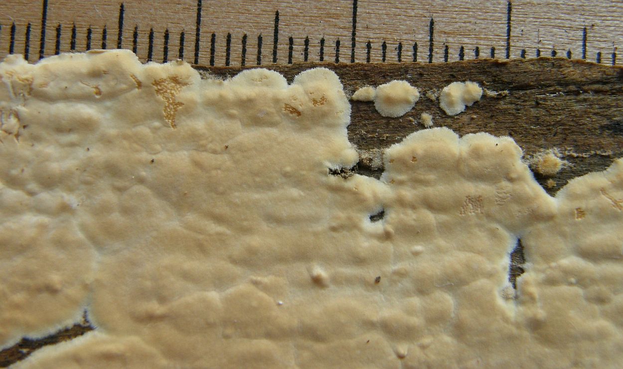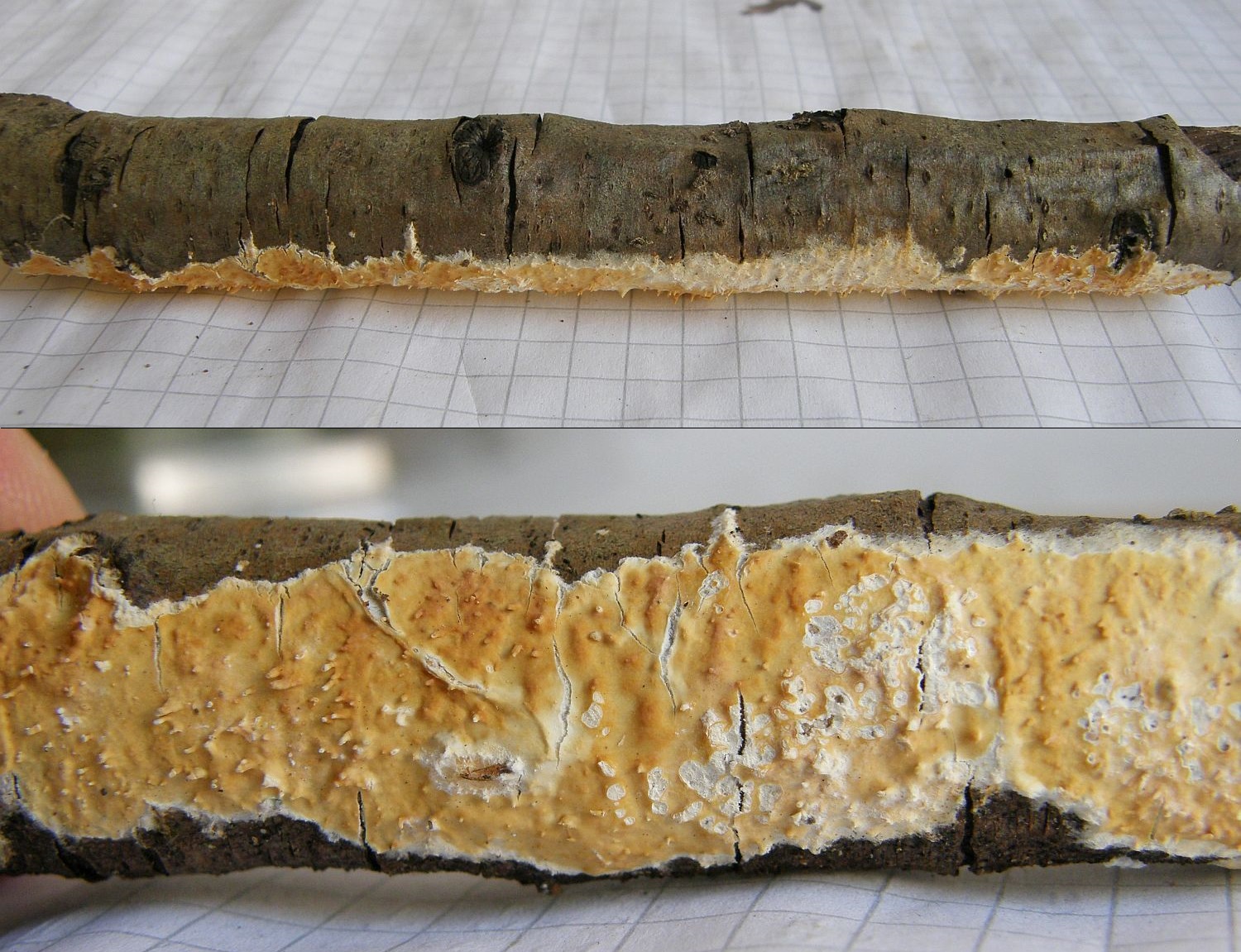 Darunter Hyphodontia alutaria (Ledergelber Zähnchenrindenpilz):