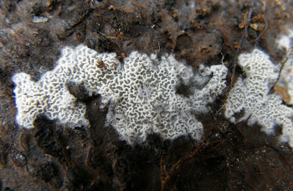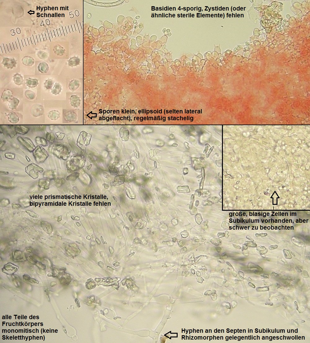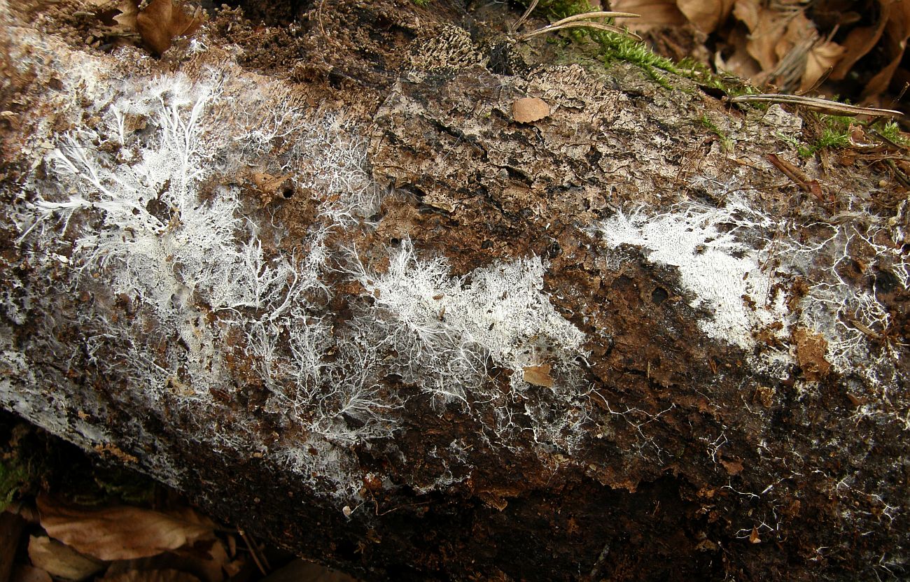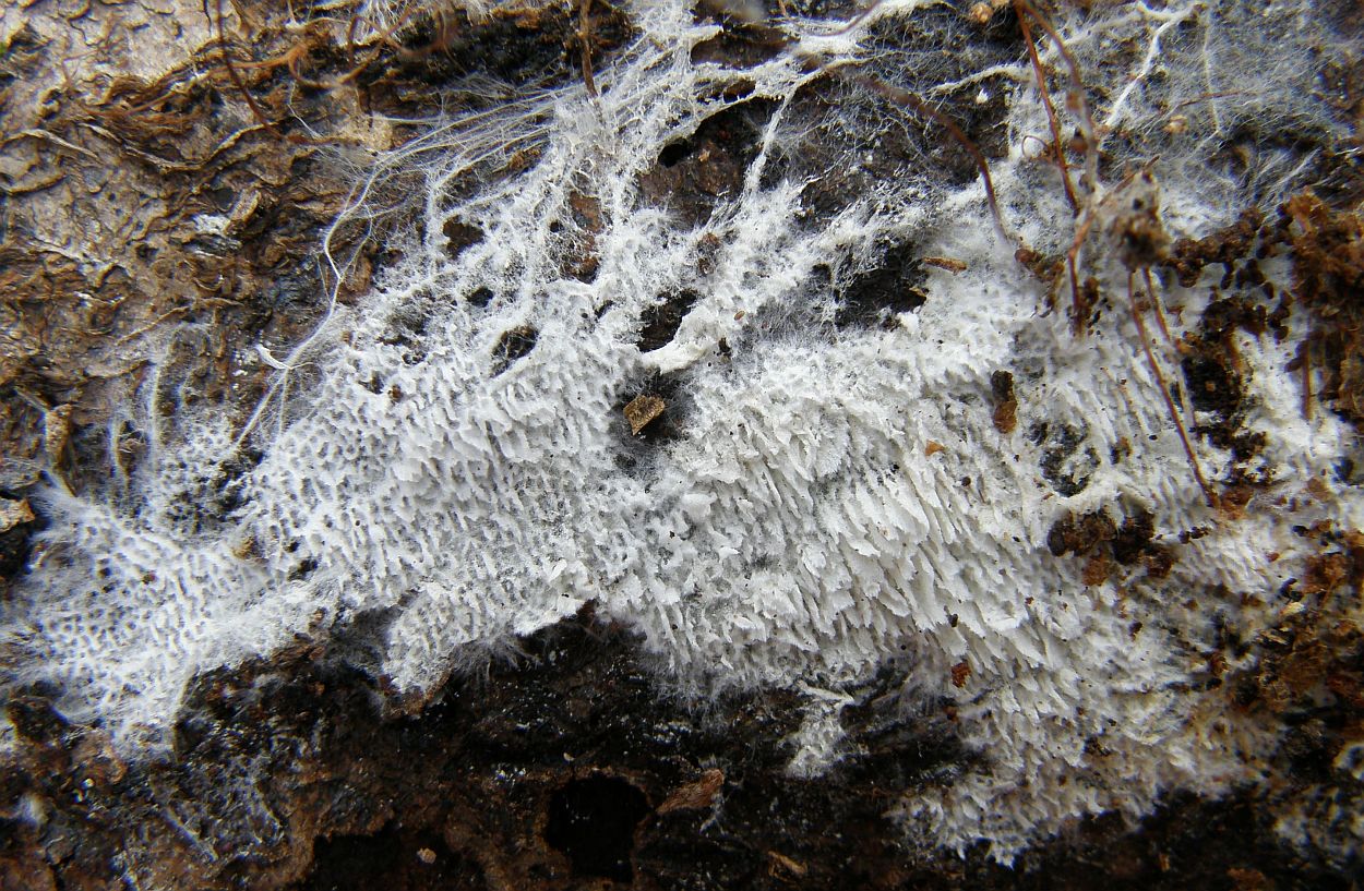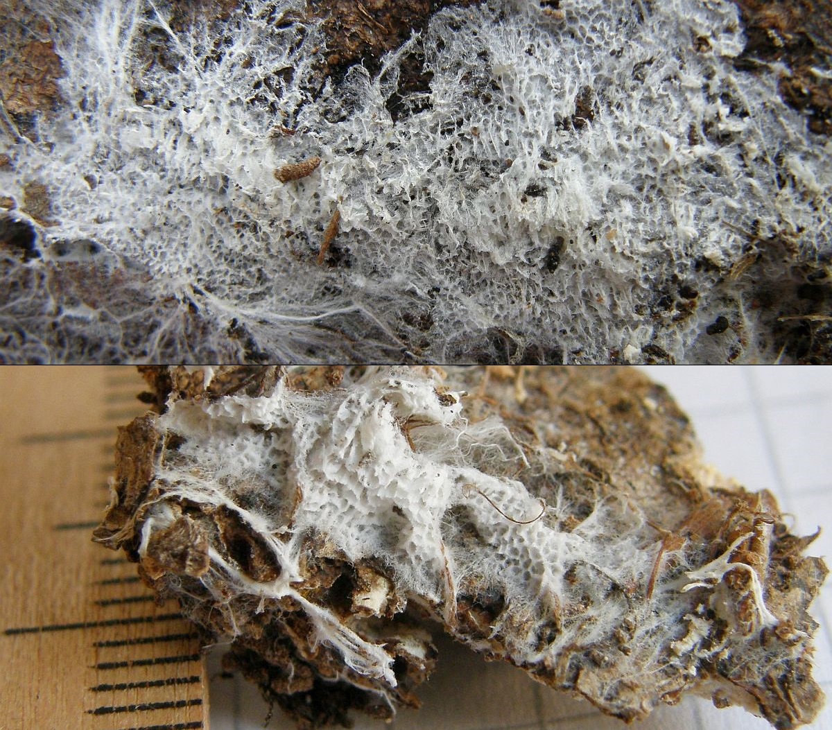 Der dünne, weiße Flausch daneben ist auch was Anamorphes. Sieht aus wie ein Haplotrichum (Anamorphe von Botryobasidium), aber ich kann es nicht bestimmen.