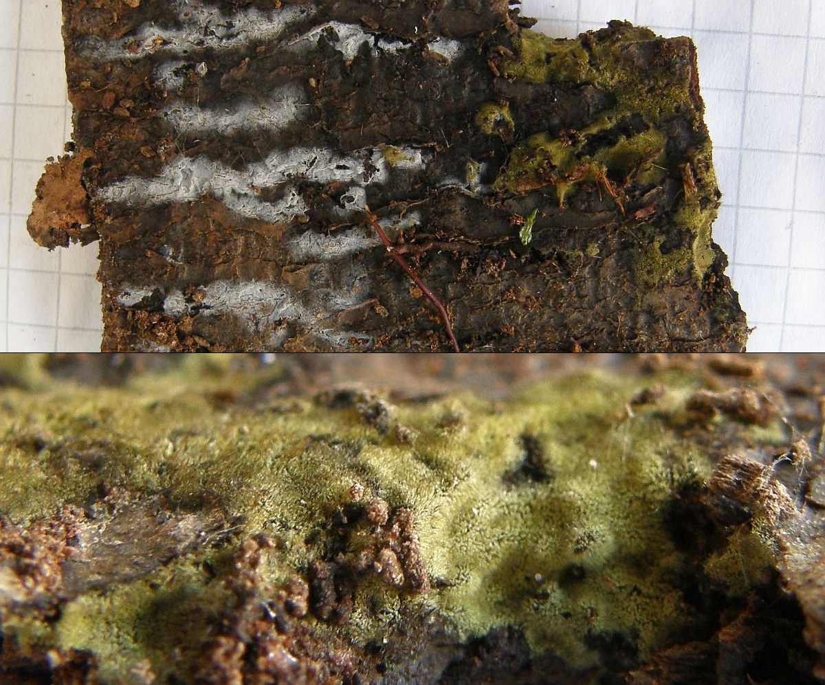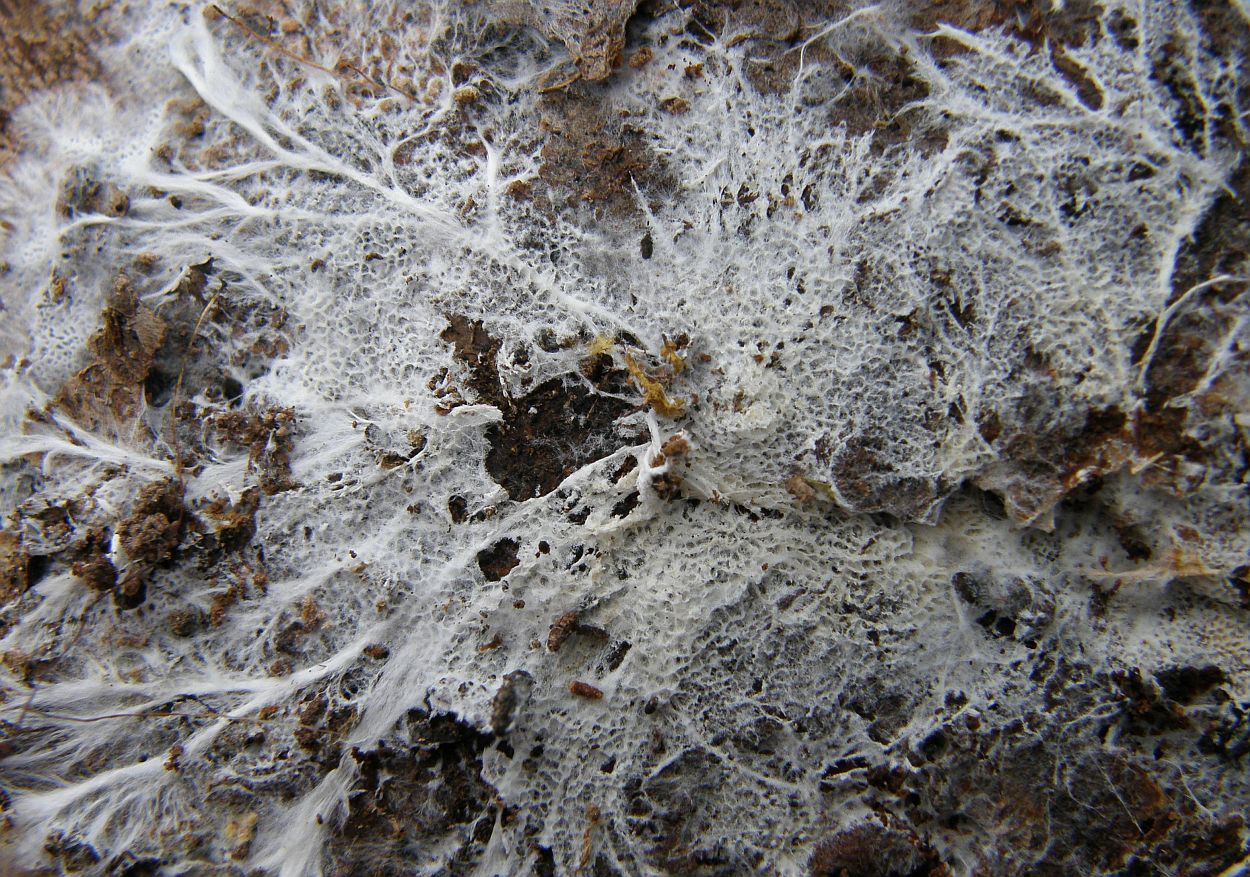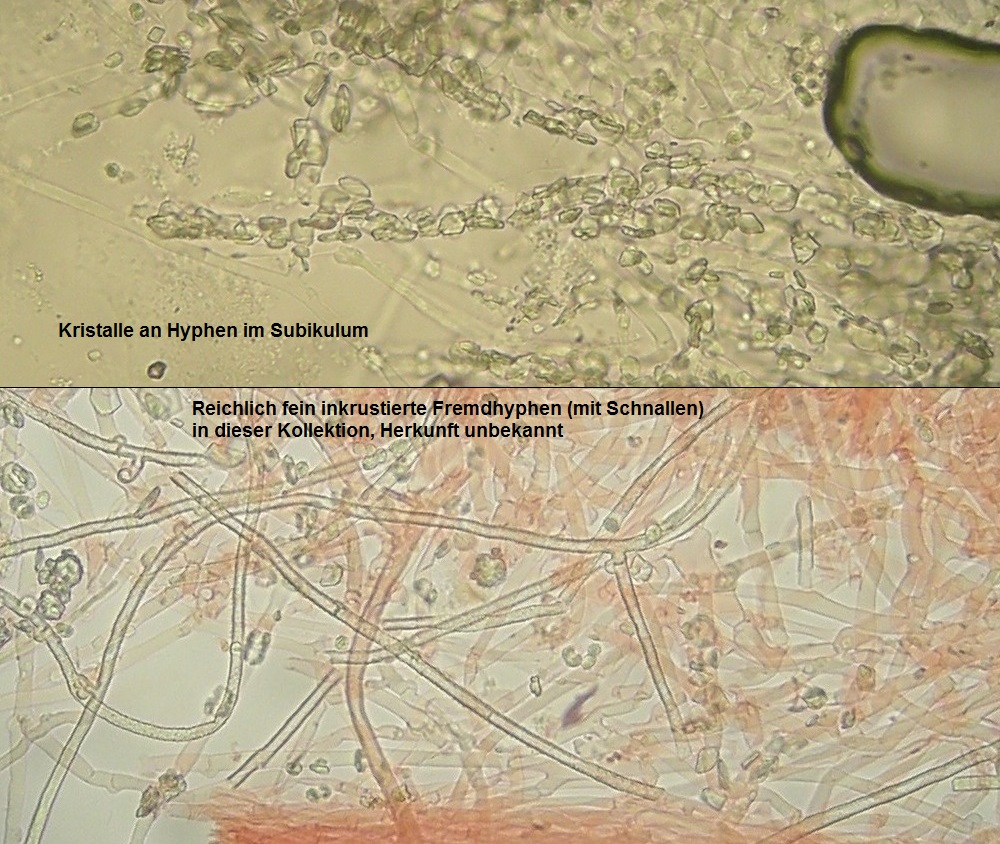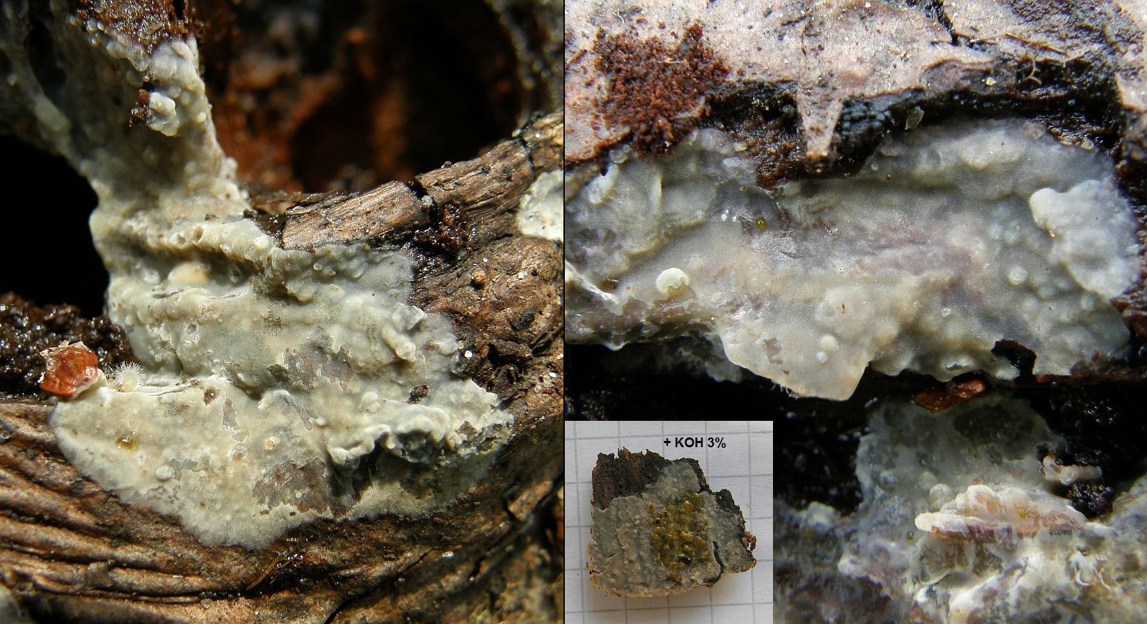 Der dünne, weiße Flausch daneben ist auch was Anamorphes. Sieht aus wie ein Haplotrichum (Anamorphe von Botryobasidium), aber ich kann es nicht bestimmen.