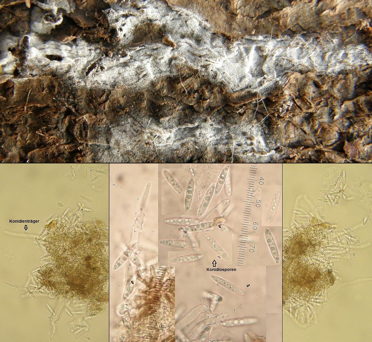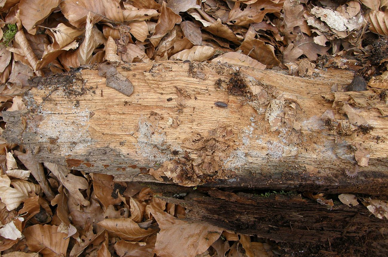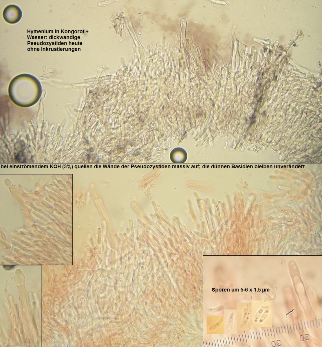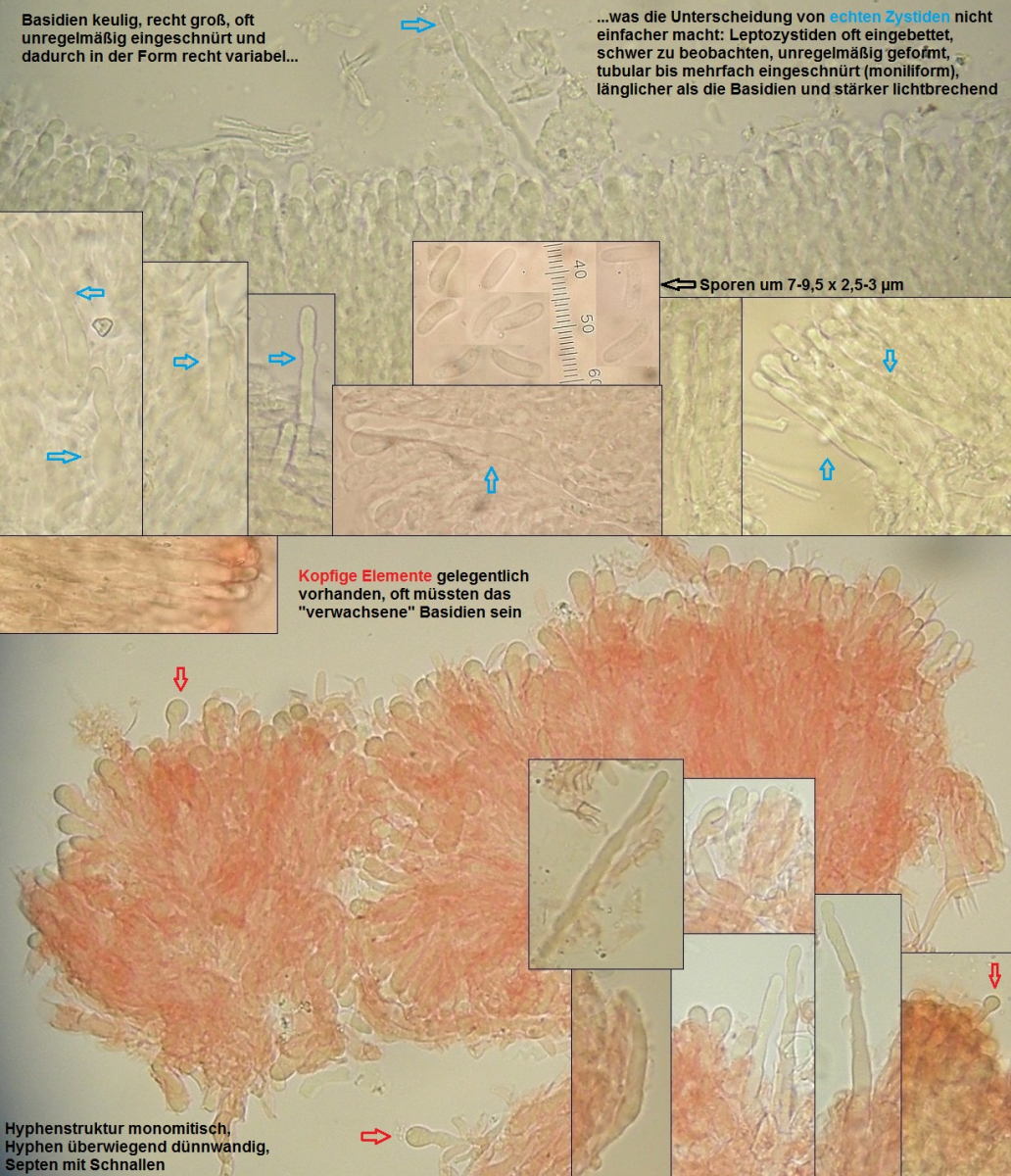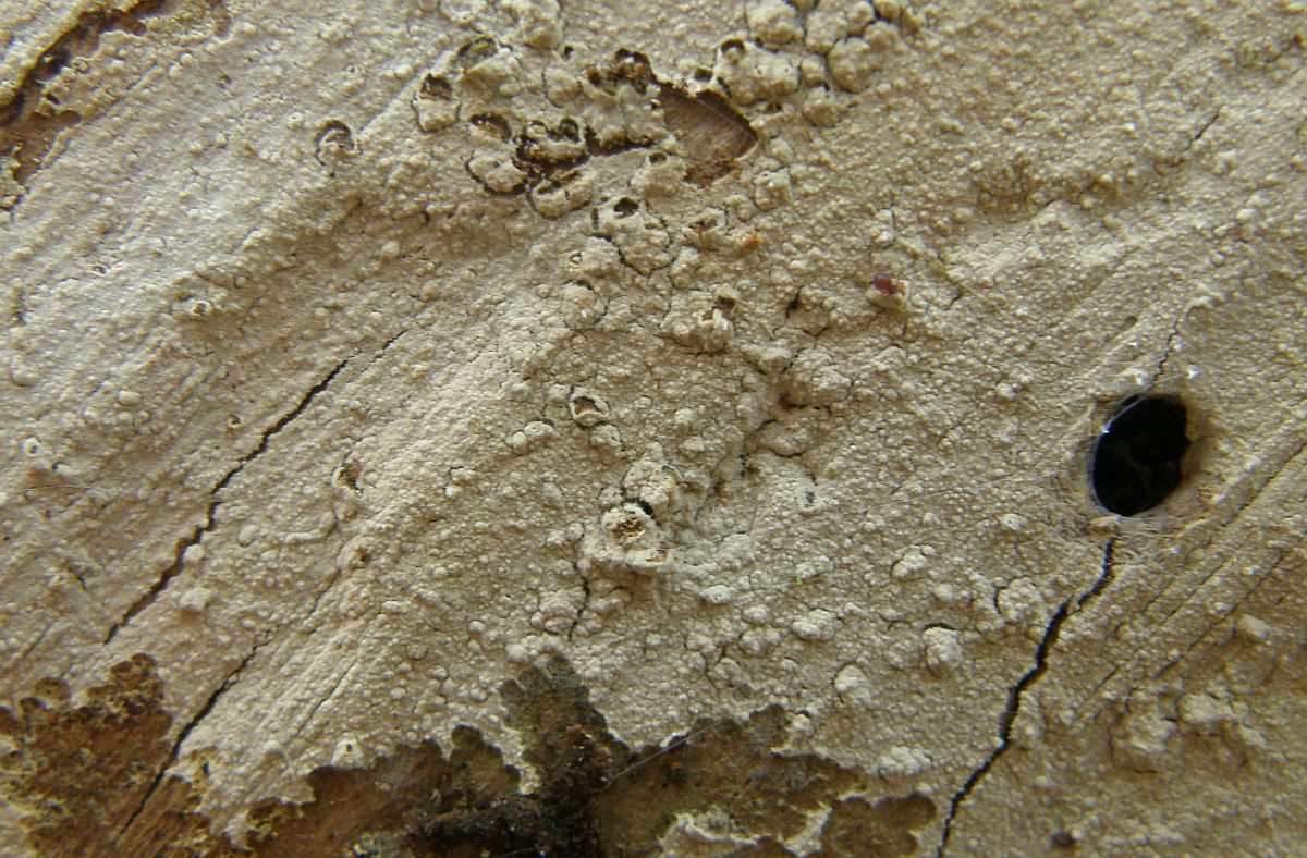 Der dünne, weiße Flausch daneben ist auch was Anamorphes. Sieht aus wie ein Haplotrichum (Anamorphe von Botryobasidium), aber ich kann es nicht bestimmen.