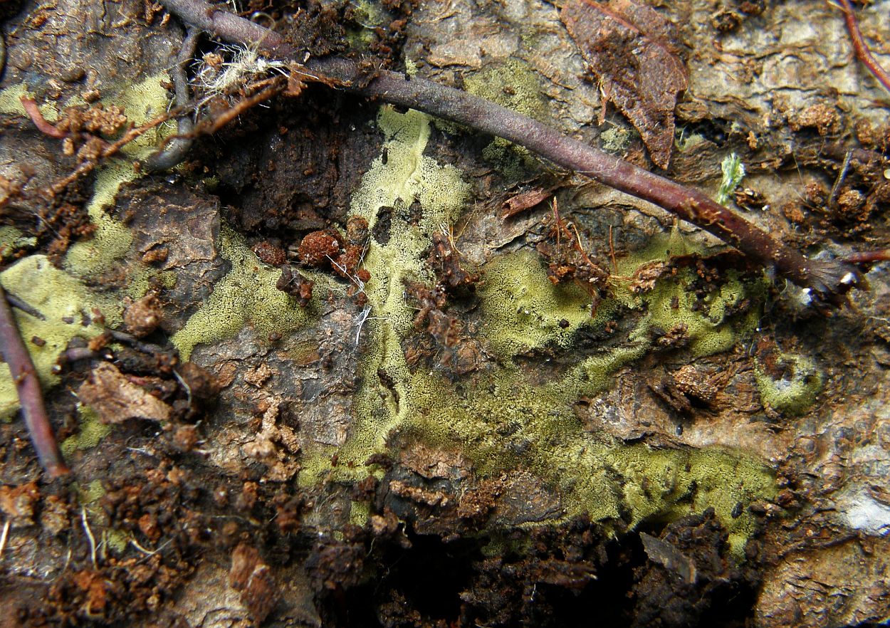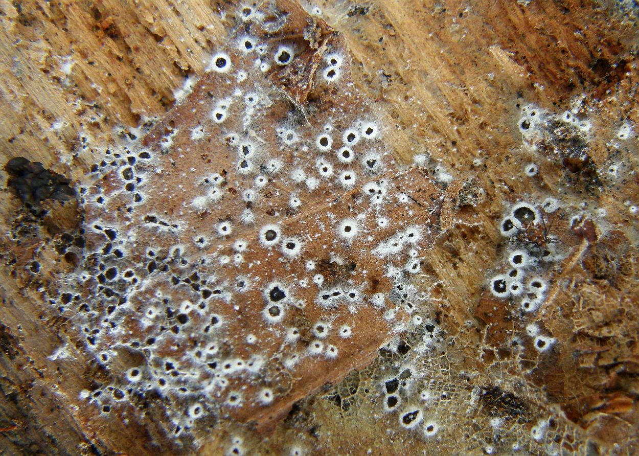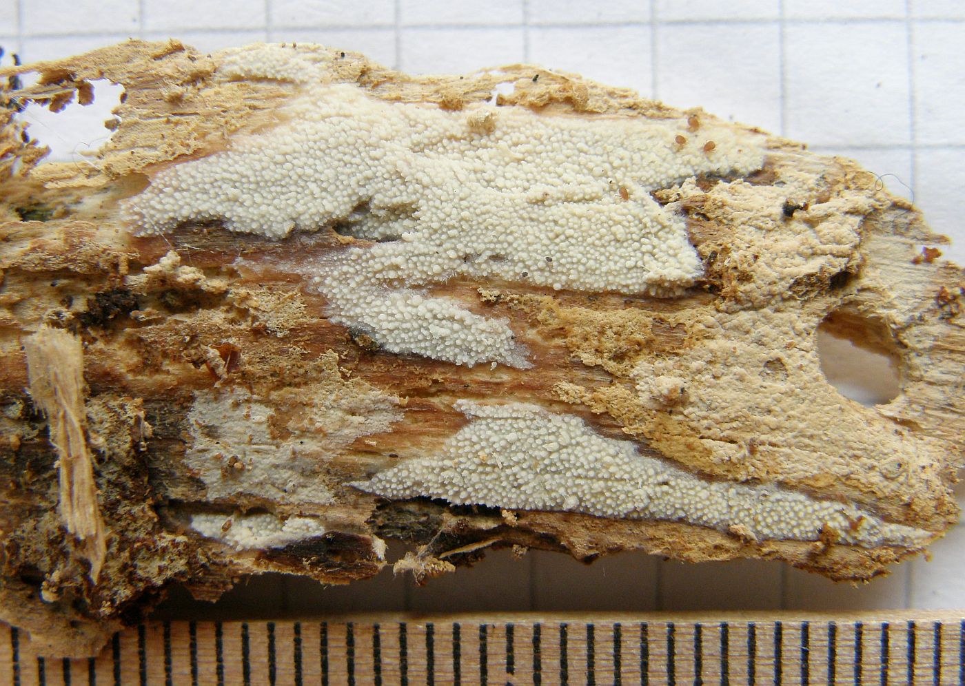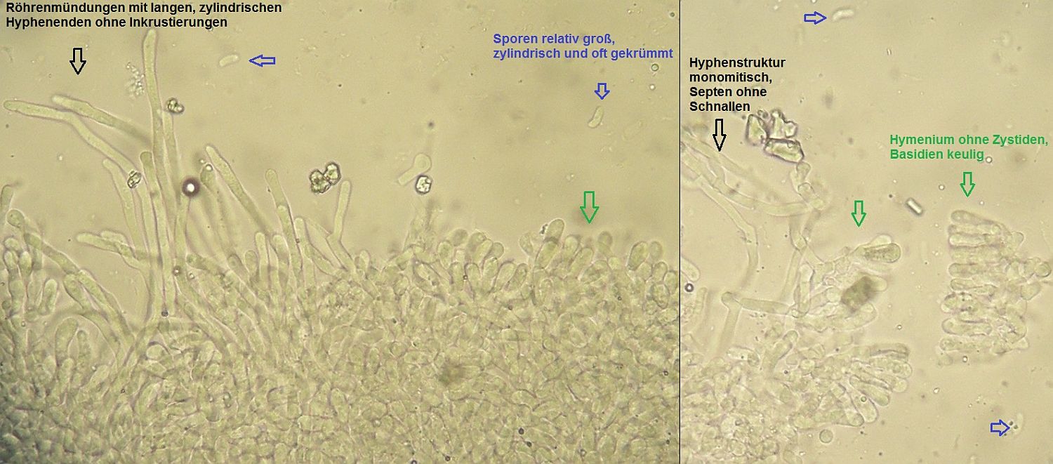Der dünne, weiße Flausch daneben ist auch was Anamorphes. Sieht aus wie ein Haplotrichum (Anamorphe von Botryobasidium), aber ich kann es nicht bestimmen.