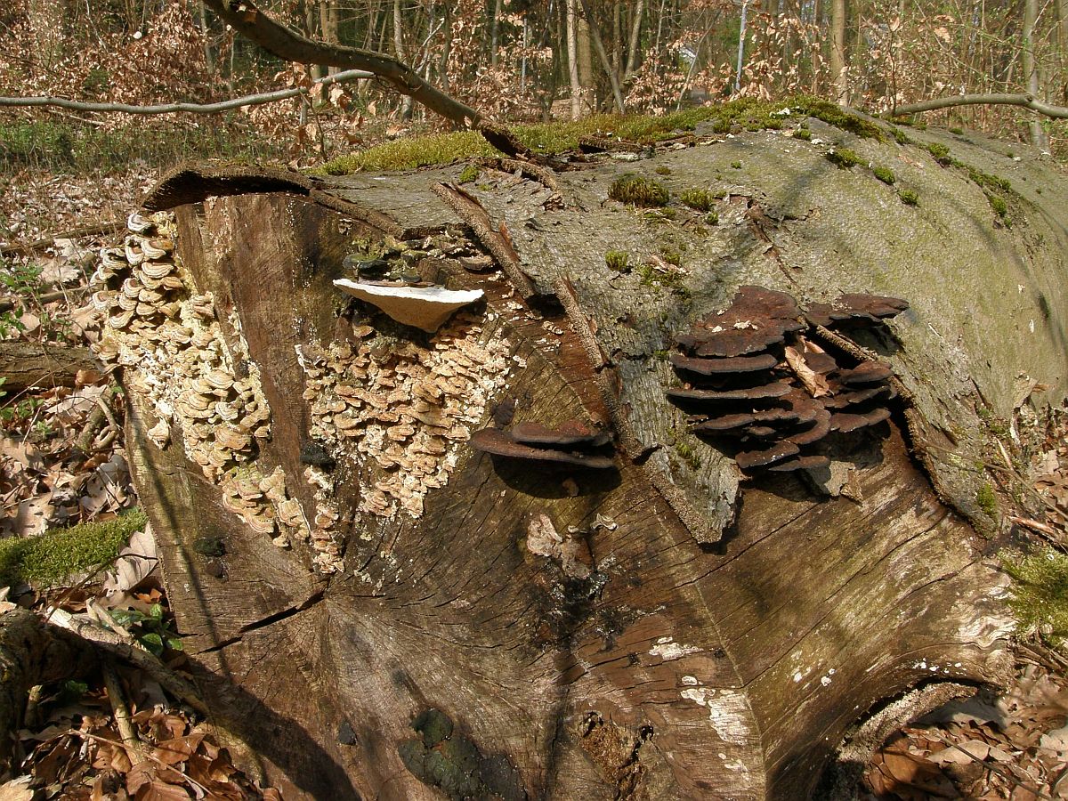 Oder Trametes versicolor (Schmetterlingstrameten) + Trametes gibbosa (Buckeltrameten) + Daedaleopsis tricolor (Dreifarbige Blättertramete) + Inonotus nodulosus (Knotiger Schillerporling, verfallene Fruchtkörper):