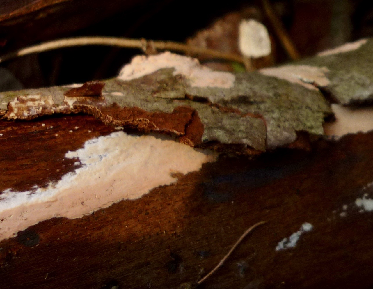 Bild 2, 4 und 5 zeigen eventuell den Fleischroten Zystidenrindenpilz (Peniophora incarnata).