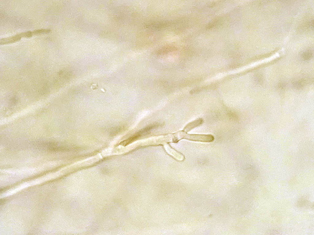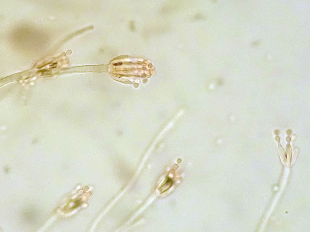 Diese geweihförmigen Strukturen mit den Konidien dran sind typisch für die Gattung Peronospora.