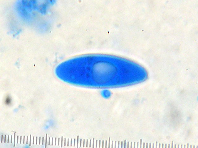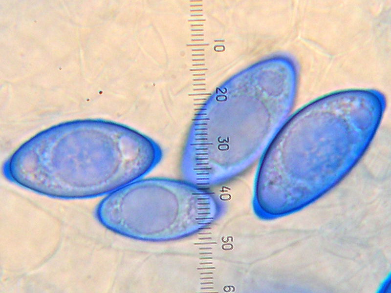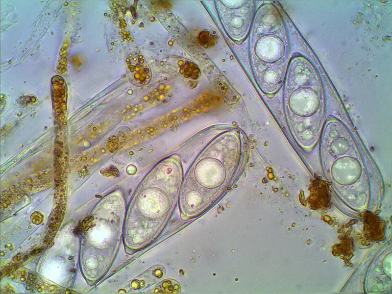 Jetzt nach fast drei Wochen sahen die Sporen dann ganz anders aus: Bis ca. 32 x 16 µm, mit schwachem, sehr feinem Ornament und deutlichen Fortsätzen an der Polen. Jetzt passt alles recht gut zu Gyromitra gigas, der Riesenlorchel. Aber darf die wirklich auf Buche? In meiner spärlichen Asco-Literatur habe ich dazu nichts gefunden.
