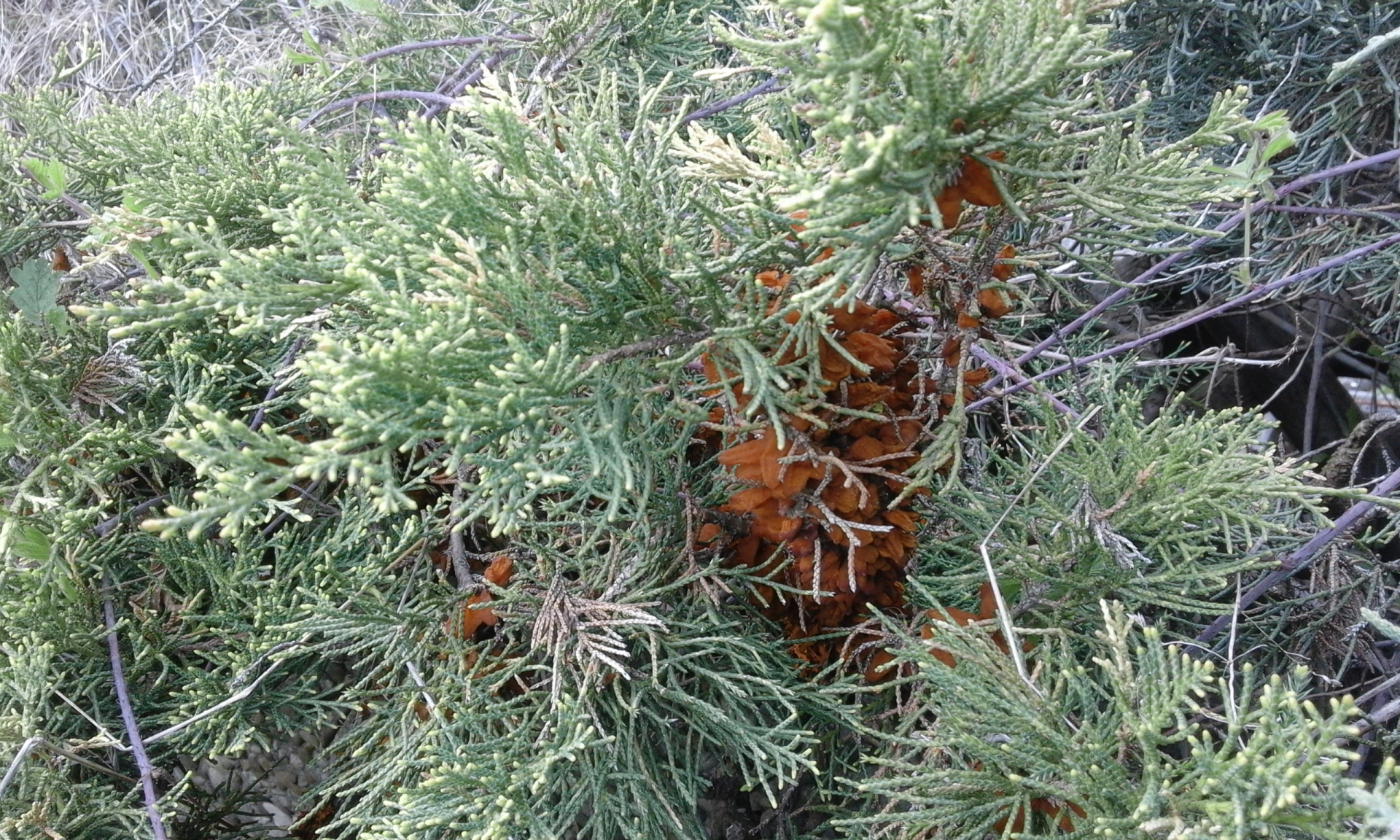 an einer wacholderstaude sind mir dann folgende mehr oder weniger abgetrockneten gebilde aufgefallen, es sollte sich um den wacholderrost/birnengitterrost Gymnosporangium fuscum handeln.