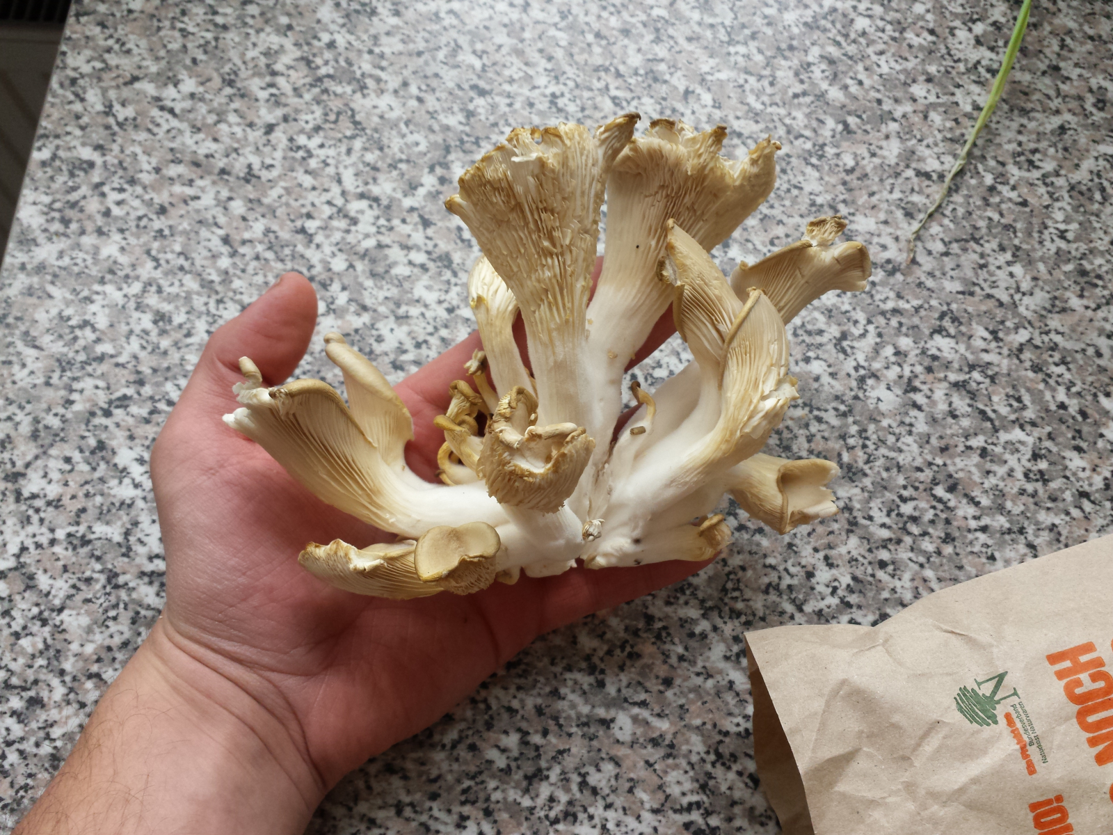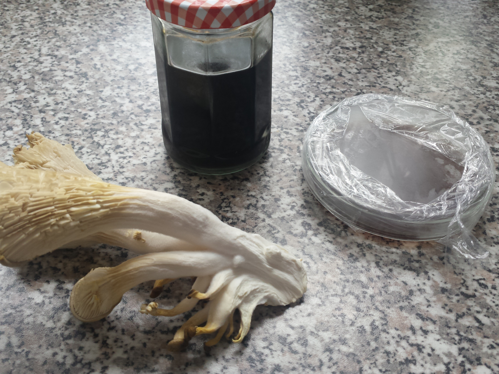 Vor 2 Tagen habe ich eine frische Traube Austernpilz um Bioladen gekauft. Dieser hat mir sehr gut geschmeckt (Austernpilz mit Zucchini, Zwiebeln, Olivenöl auf Nudeln, Salz Pfeffer). Nun versuche ich auch diesen zu Klonen. Da ich noch ein Glas mit Schwarzbier und Traubenzucker und eine Petrischale mit SchwarzBier, Traubenzucker und Agar im Kühlschrank hatte, konnte ich sofort starten.