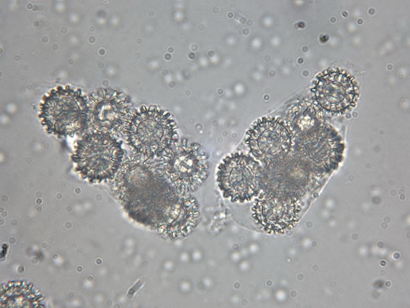 Die Sporen haben bei diesem Reifegrad bereits die Asci verlassen.