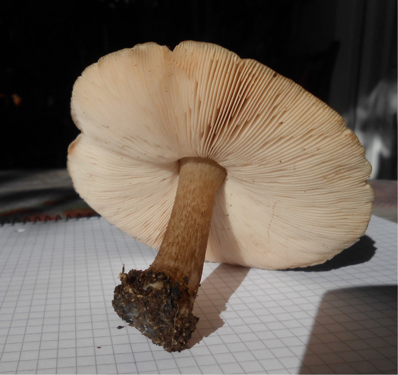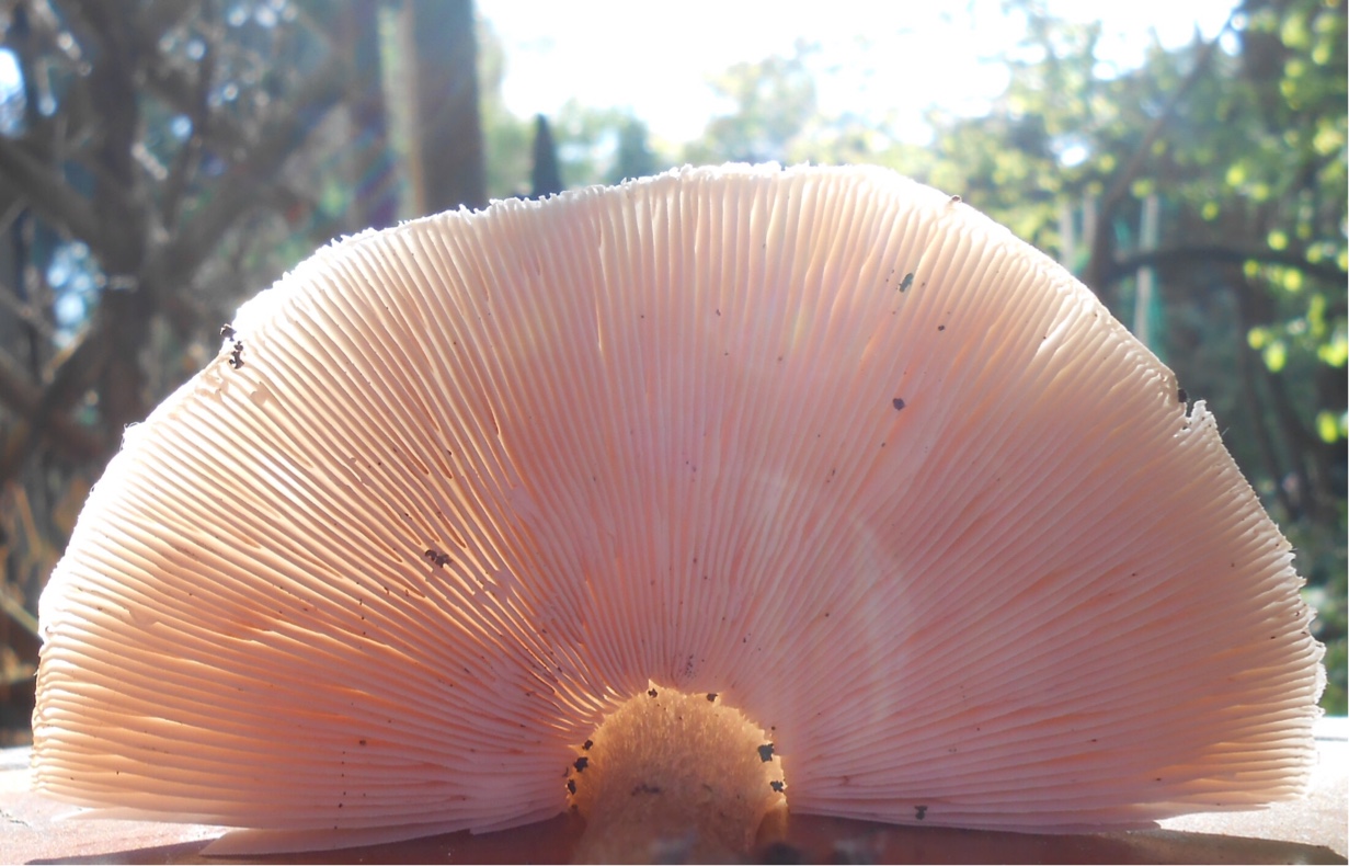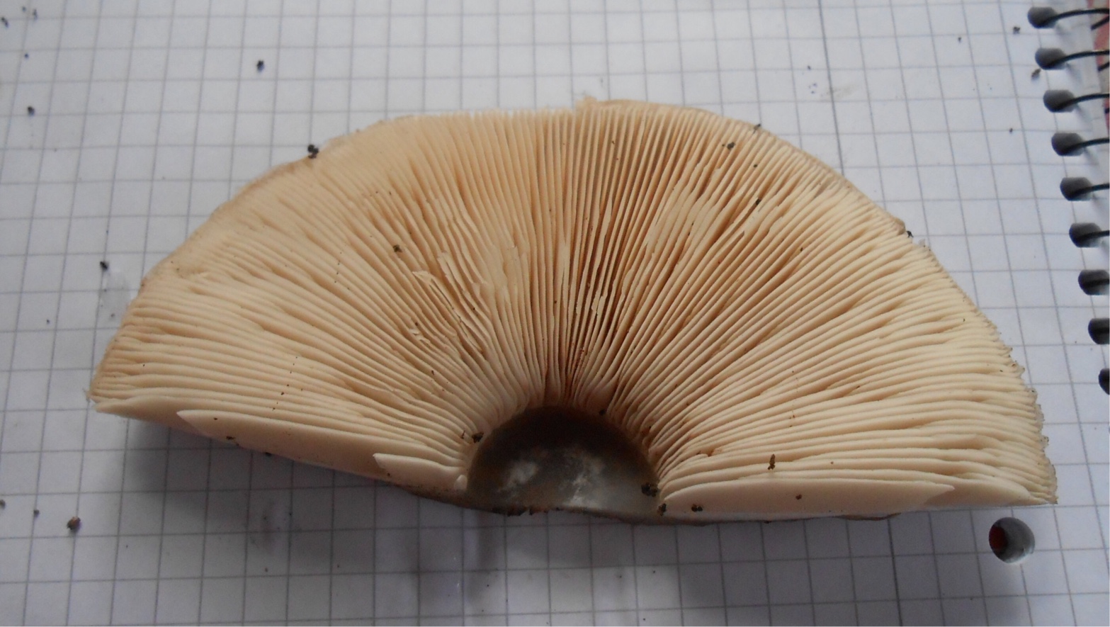 FRUCHTSCHICHT: Lamellen frei, stark nach unten gewölbt, mit kürzeren "Zwischenlamellen" und recht fein. Cremeweißlich-hautfarben. Bei alten Exemplaren Lamellen rötlich.