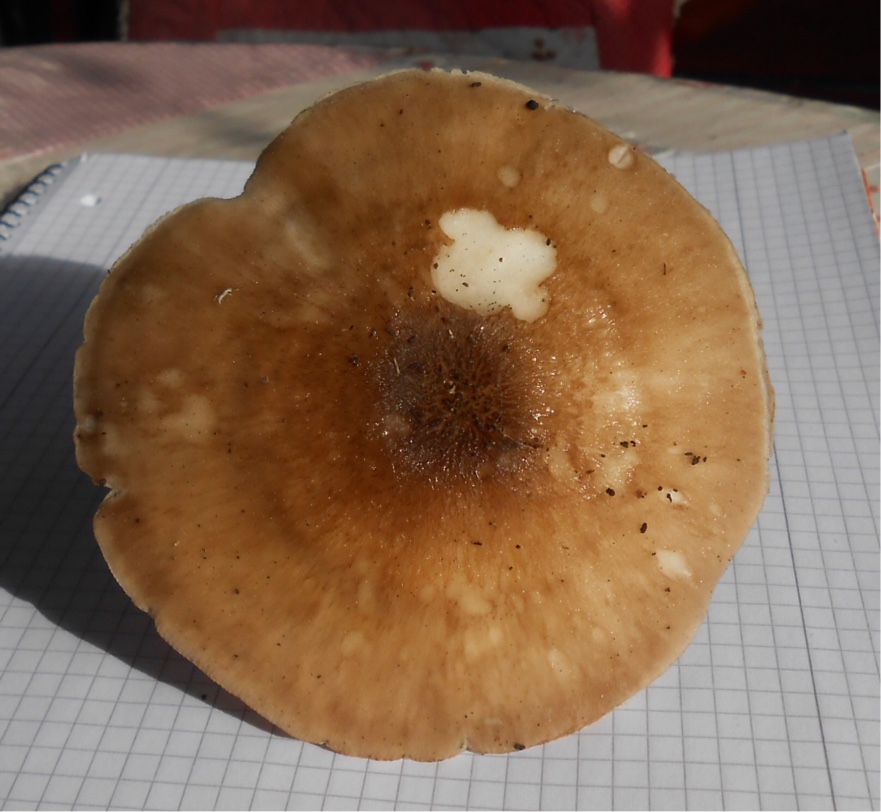 Der HUT: Die Form je nach Alter konisch bis schirmartig-flach, ältere Exemplare am Rand des Hutes etwas gespalten/gerissen und hochgewölbt. Mitte leicht gebuckelt, ca. 6 - 12cm im Durchmesser, Oberseite glatt, leicht glänzend, feucht etwas dunkler. Mitte dunkelbraun, nach außen hin immer heller werdend, ebenfalls mit leichter faserig-netzartiger Radialzeichnung.