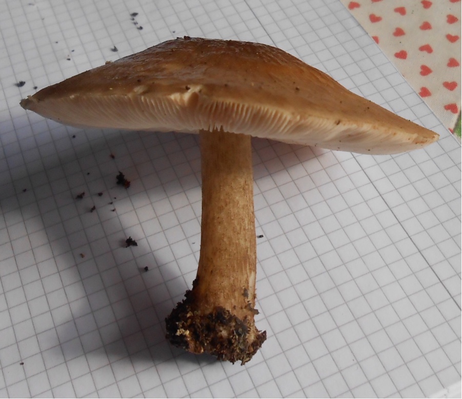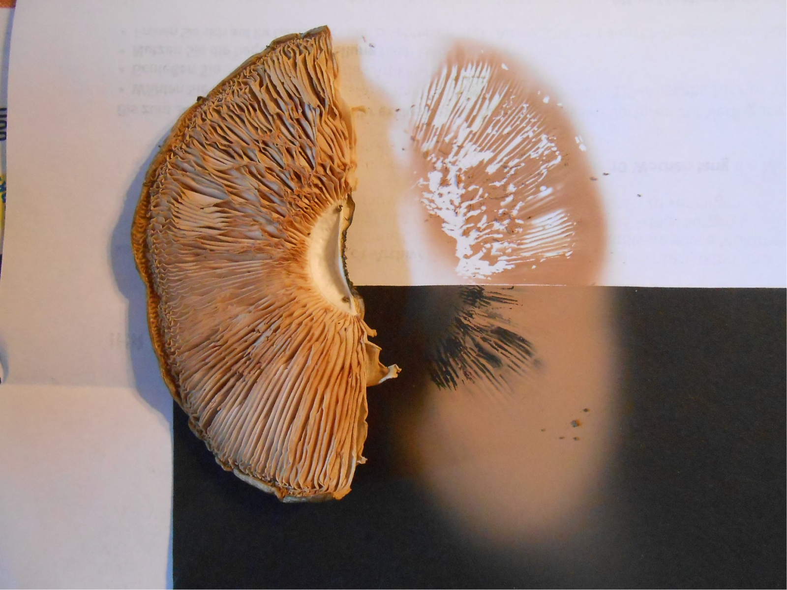 Sooooo, hier ist ein Foto vom Sporenabwurf! Das ging ja schnell! Ich legte den (halben) Hut heute morgen auf die Heizung, und heute abend hatte er schon ausgesport!! Wie man sieht, ist das Sporenpulver rötlich-hellbraun. Die Lamellen haben sich gleich mitverfärbt.