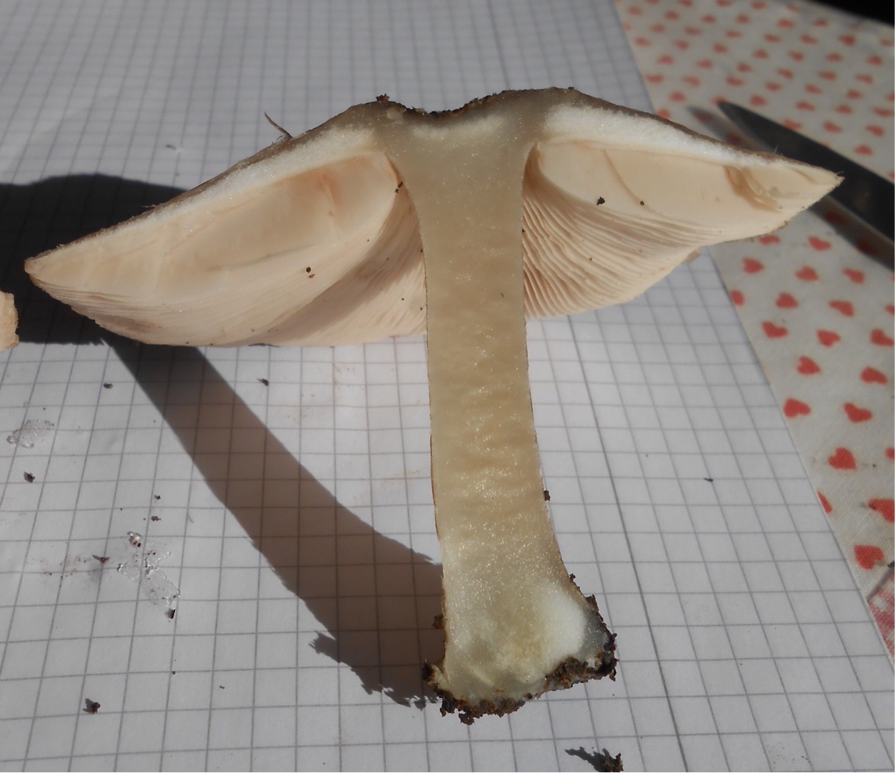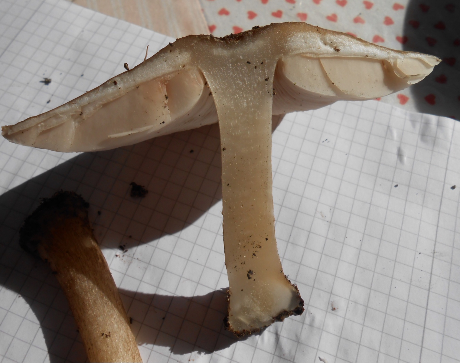 Also hab ich mich heute morgen echt gefreut, als ich die Stelle nochmal untersuchte und der Pilz an derselben Stelle wieder Fruchtkörper gebildet hat! Sie sehen schön und frisch aus, und ich habe einen gepflückt, fotografiert, auseinandergeschnitten und wieder fotografiert.