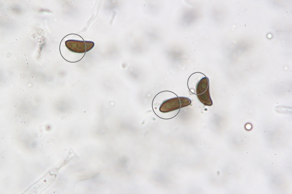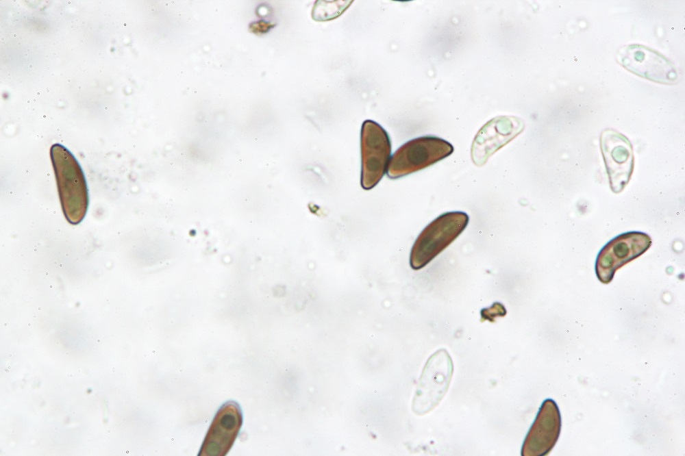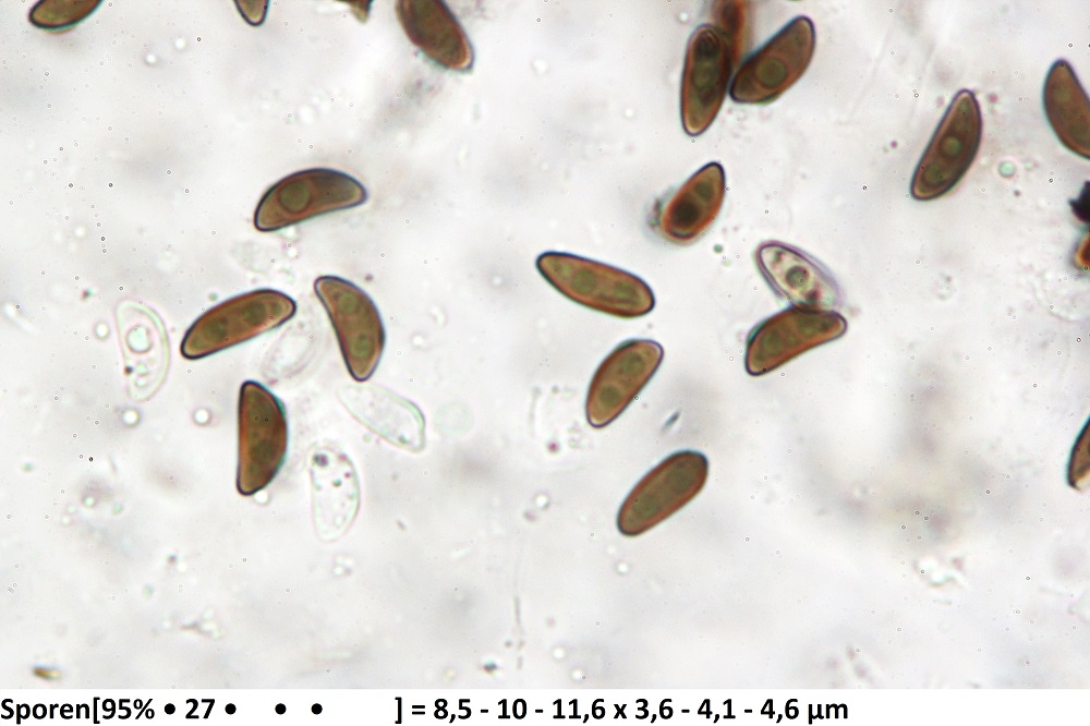 Sporen einzellig, braun, ellisoid bis bohnenförmig (Abb. 7), mit Keimspalte (Abb. 8), glatt, 10-12 x 4-5 µm.