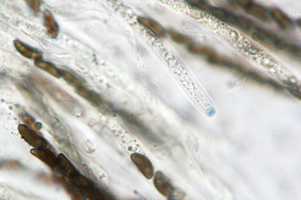 Asci langgestielt, 8-sporig, Ascusporus IKI-positiv blau, Sporen im Ascus uniseriat angeordnet (Abb. 4-6).