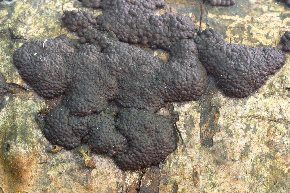 Stromata einzeln, wulstig, meist quer zur Wuchsrichtung des Substrates wachsend (Abb. 1), auch zu größeren Reihen oder Flächen zusammenwachsend, höckrig durch die Perithecien (Abb. 2). Größe des Einzelstromas bis 30 x 10 mm und bis 5 mm hoch, außen schwarzbraun, innen schwarz.