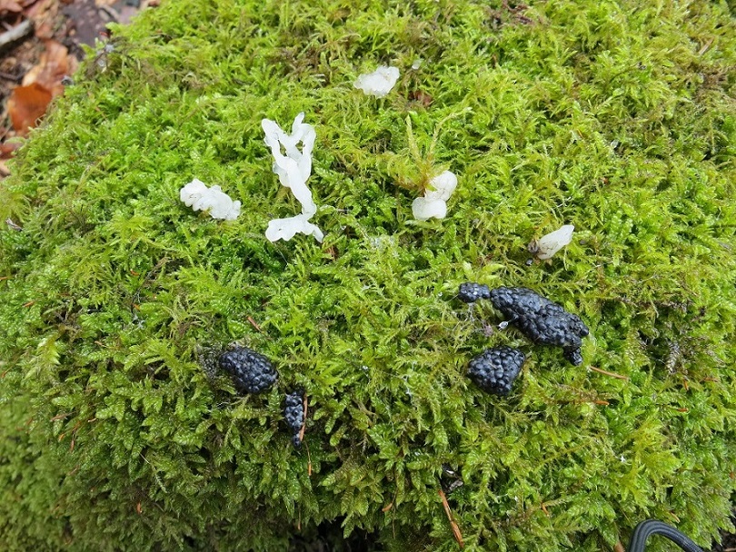 Und dann fanden wir auf einem vermoosten Stubben diese, auch hier im Forum schon vorgestellten, Gebilde: "Sternenrotz"; aufgequollene und von Greifen ausgewürgte Eileiter von Amphibien; heisst es. Oder habt ihr dazu andere Ideen?