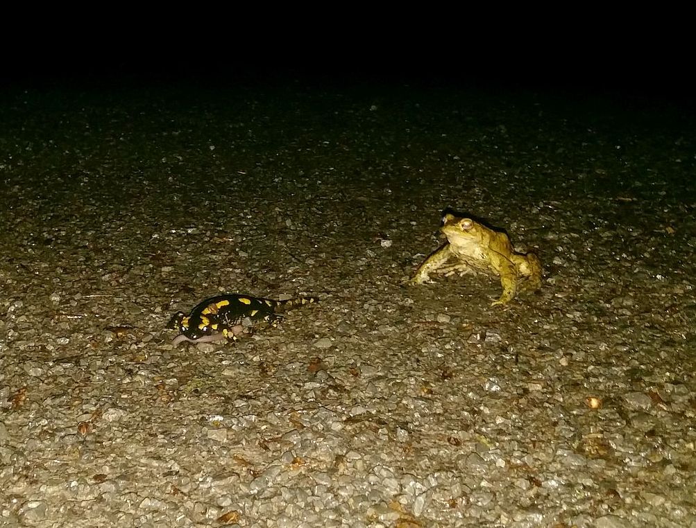 Bild von heute Nacht: Lurchi mit Kröte. Sprechen sich gerade ab, wo denn der beste Laichplatz ist. Neben 20-30 Kröten locker 50 Feuersalamander umherwatscheln sehen.