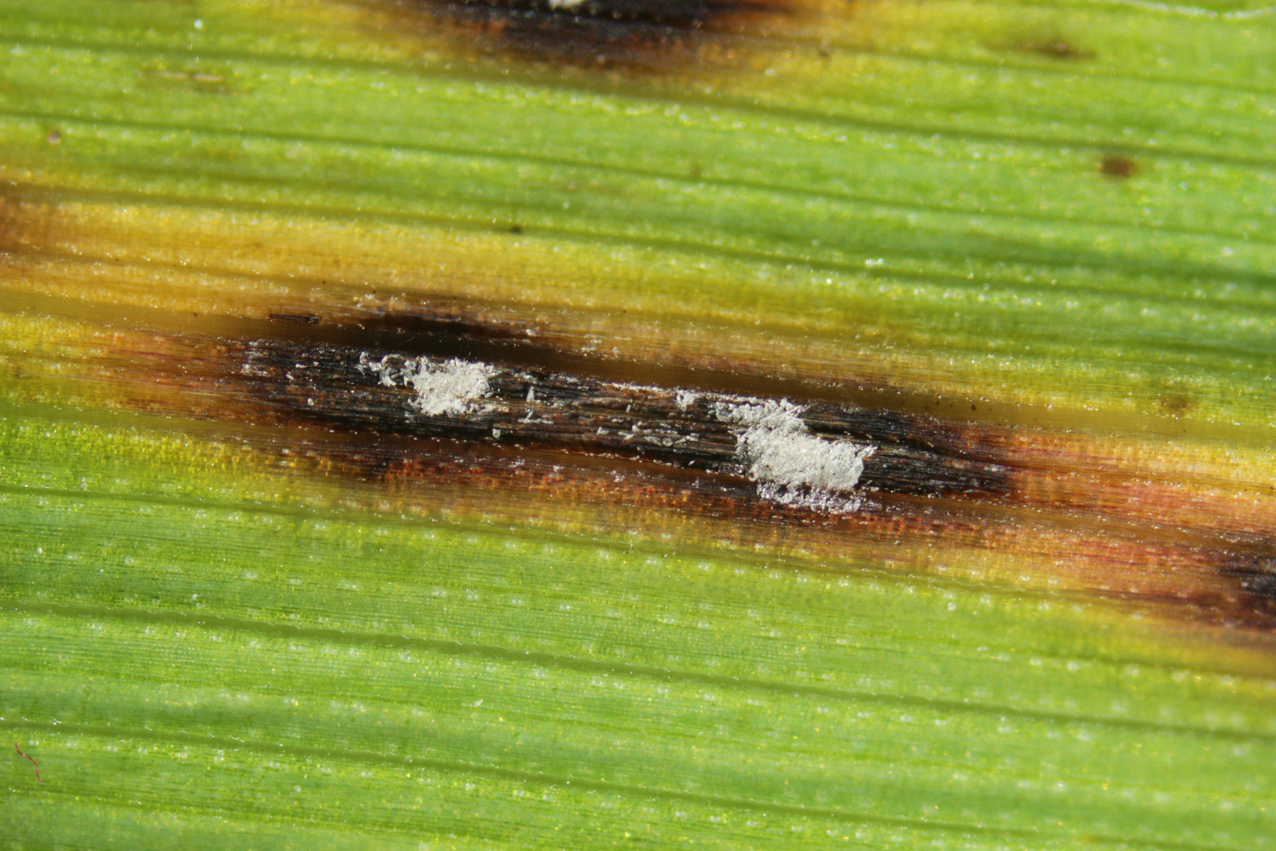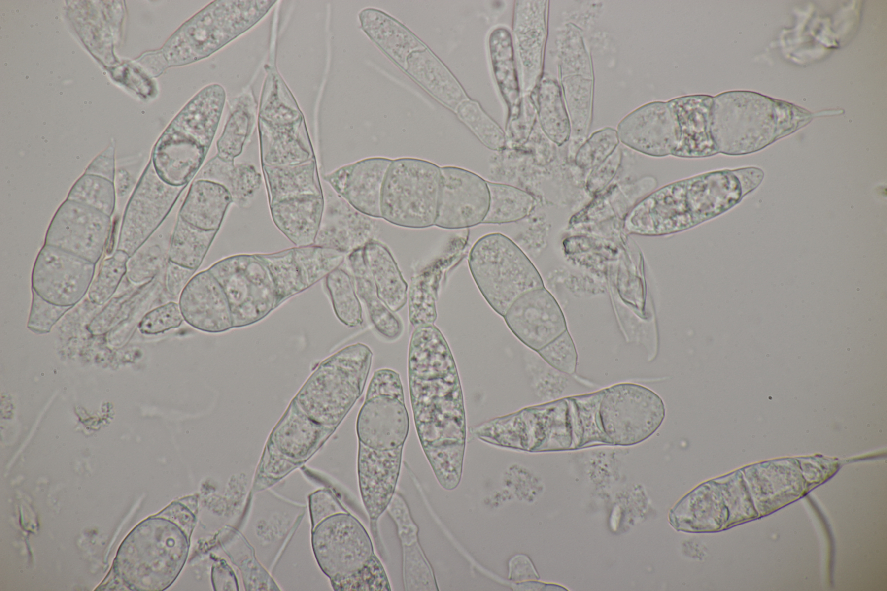 Wenn ihr diese Sporen nicht nachweisen könnt, dann legt die Blätter mal über Nacht in eine feuchte Kammer oder einen verschlossenen, aufgeblasenen Plastikbeutel mit ein paar Tropfen Wasser drin. Wenn dann keine Konidien nachweisbar sind, dann haben die Blattflecken andere Ursachen.