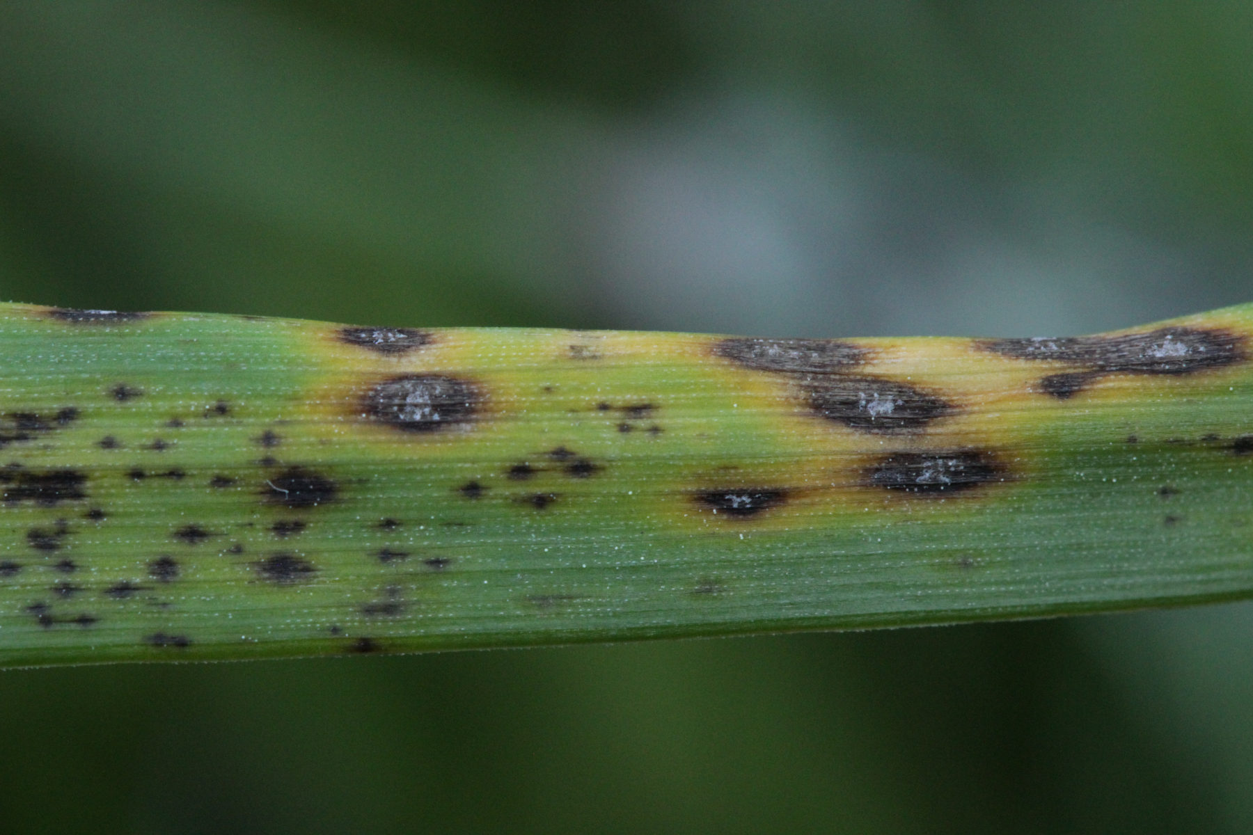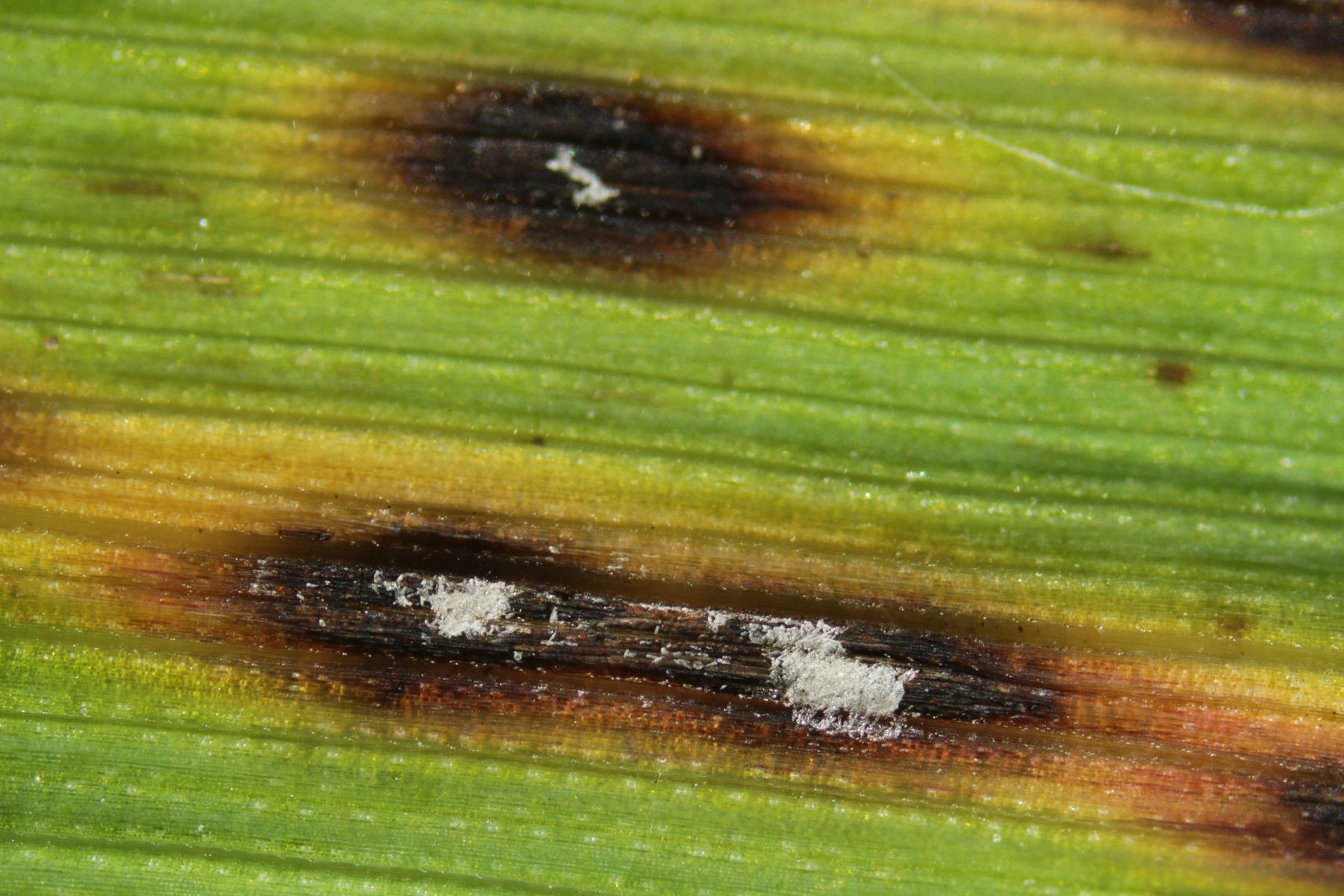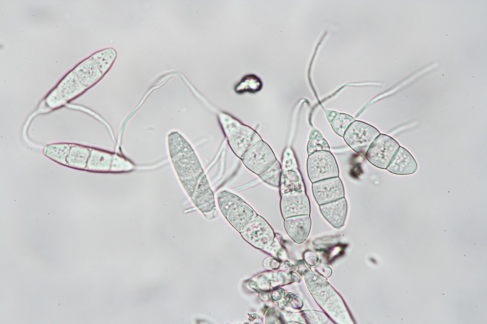 Wenn ihr diese Sporen nicht nachweisen könnt, dann legt die Blätter mal über Nacht in eine feuchte Kammer oder einen verschlossenen, aufgeblasenen Plastikbeutel mit ein paar Tropfen Wasser drin. Wenn dann keine Konidien nachweisbar sind, dann haben die Blattflecken andere Ursachen.