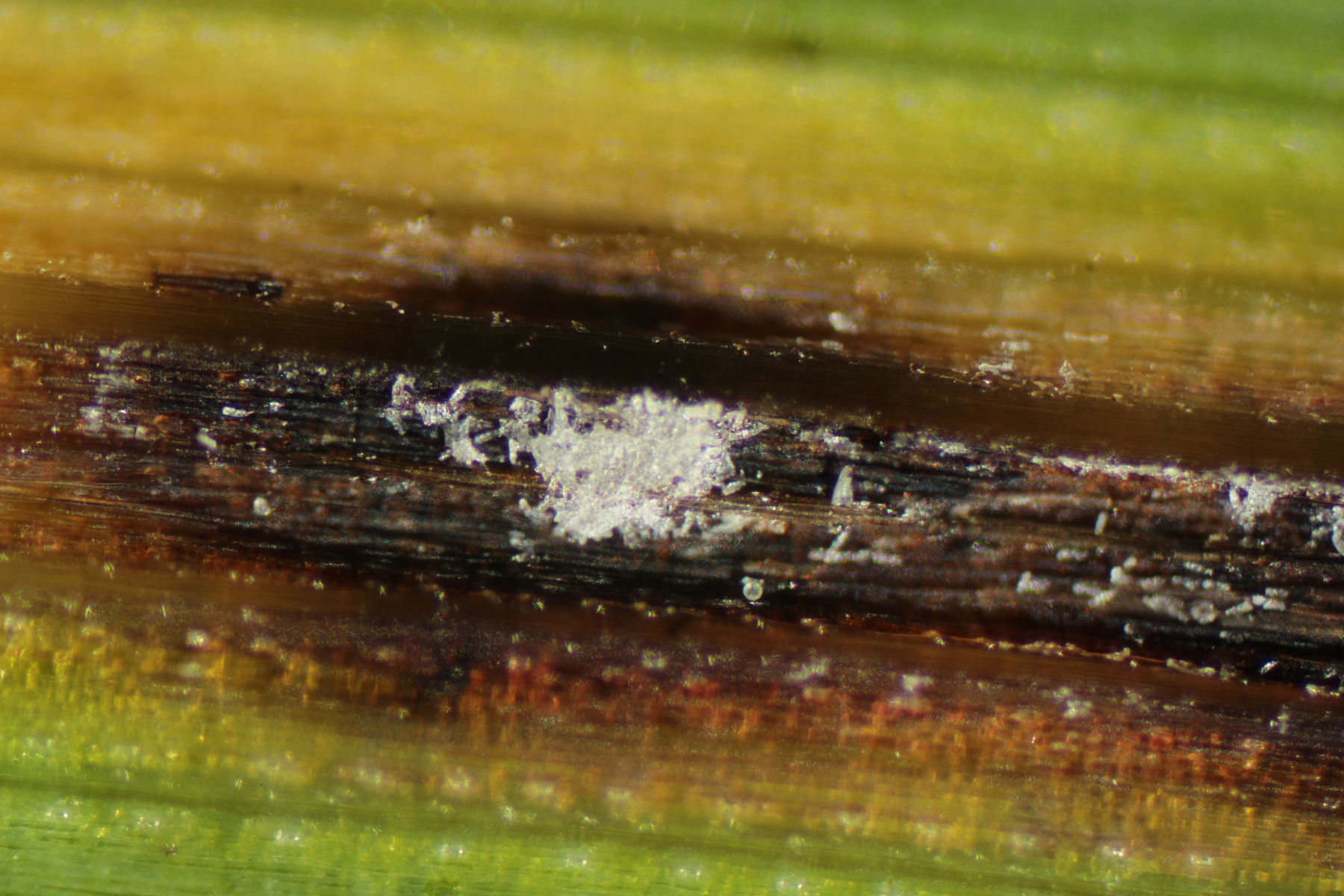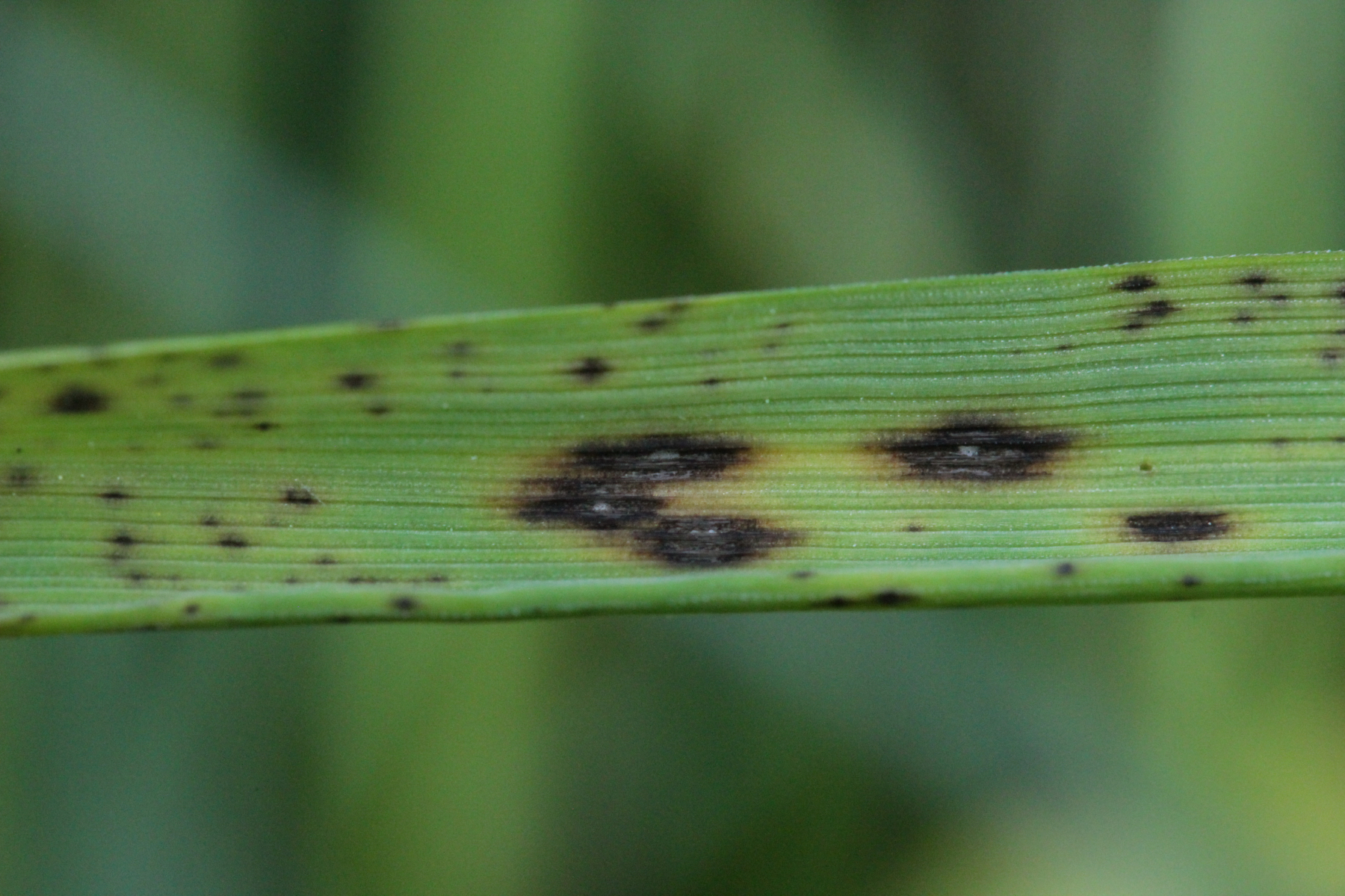 Fangen wir mit einem Pilz an, der recht häufig, leider aber vollkommen unterkartiert ist. Ich rede von Mastigosporium album, einem sehr häufigen Blattfleckenerreger auf dem Gemeinen Wiesenfuchsschwanz Alopecurus pratensis. Die wenigen Fundpunkte in Deutschland sind ein Witz. Nur noch eine kurze Bemerkung zur taxonomischen Stellung der Pilzart. Diese ist unsicher, denn eine teleomorphe Form konnte bisher noch nicht nachgewiesen werden. Sicher ist, dass sie zu den Pezizomycotina gehört.