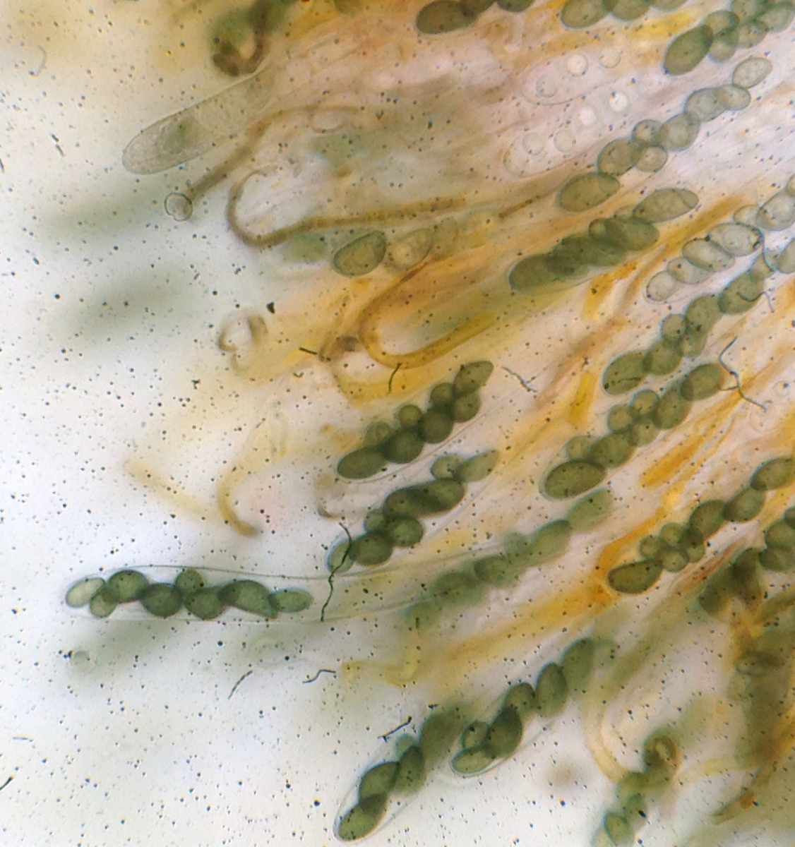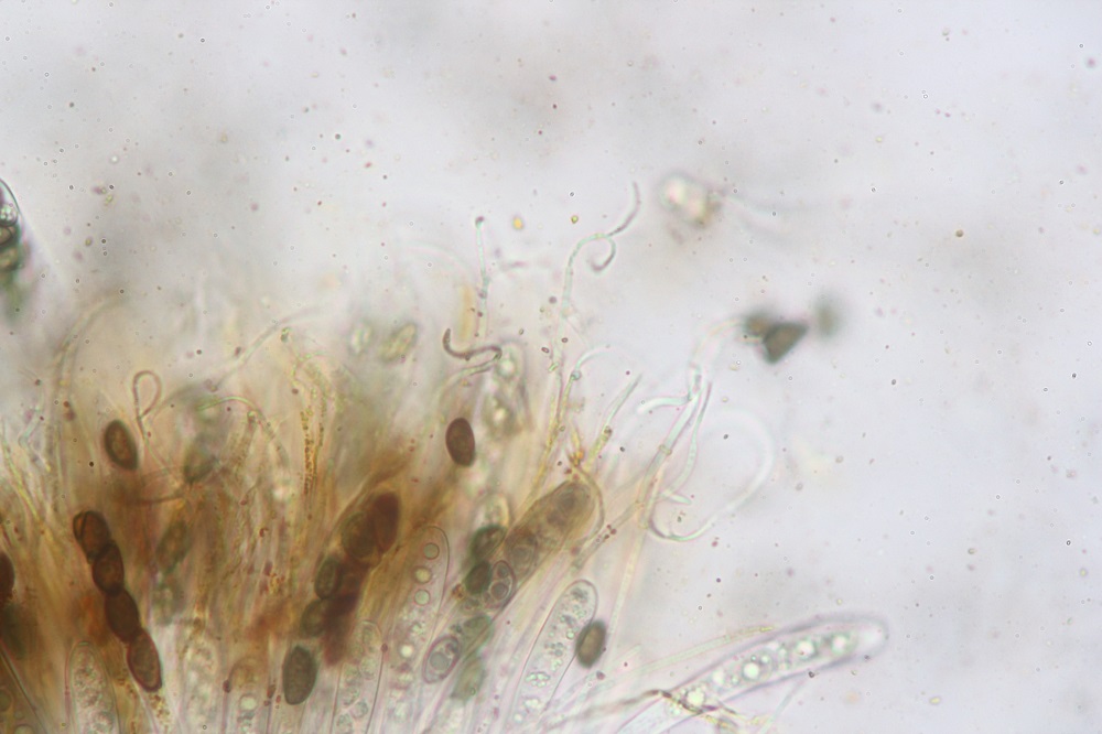 Asci : zylindrisch keulig , 8 sporig , doch sind nur 4 davon gut entwickelt die anderen bleiben hyalin und klein