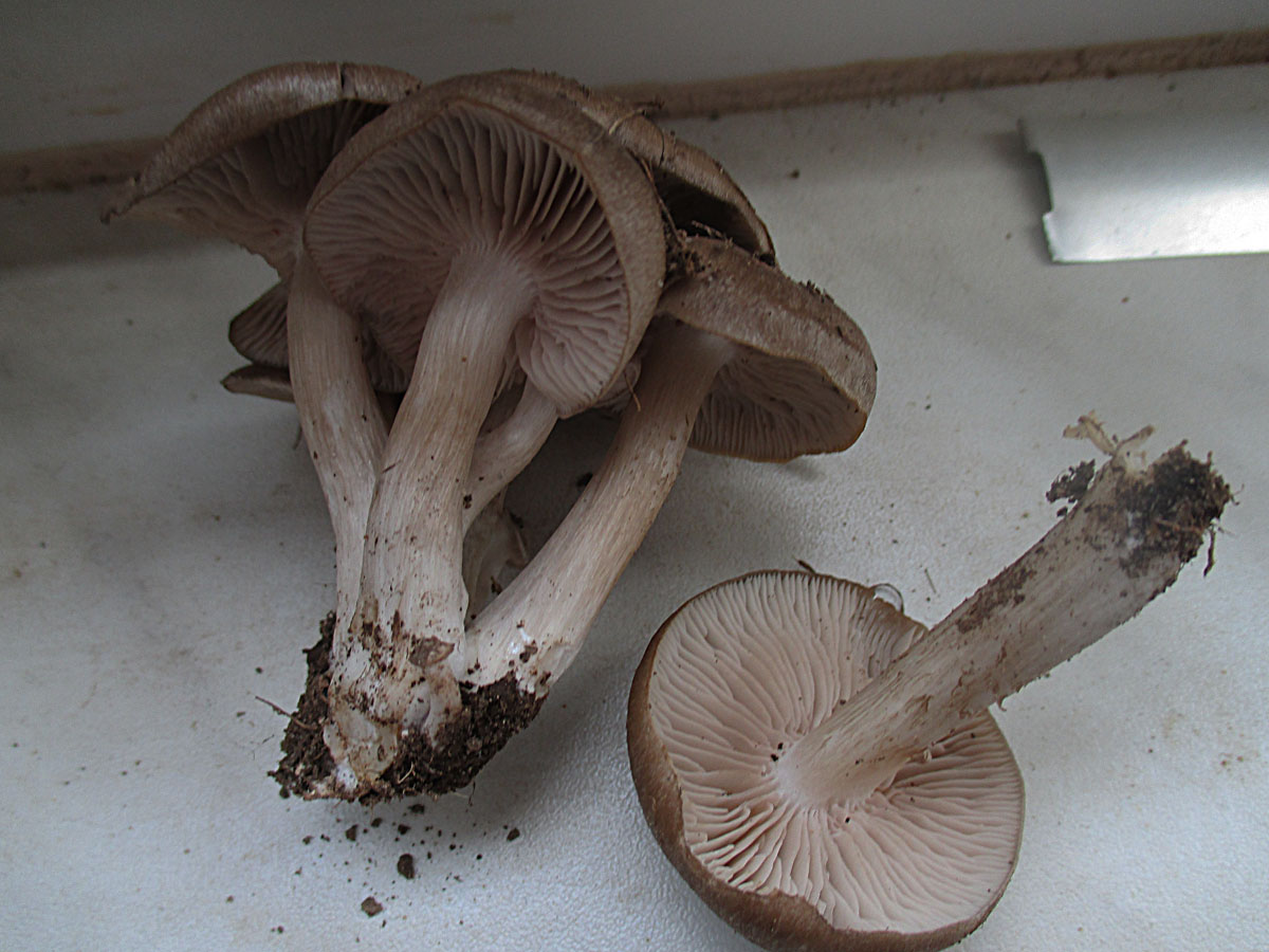 Sandkasten bei Speyer an offener Stelle auf Sandboden in Blätterstreu unter Eiche, auch Kiefer, Pappel und Birke in der Nähe; Geruch erst unauffällig, im Anschnitt stark mehlartig, Hüte radialfaserig, glatt, bereift, nicht hygrophan, Hutrand ungerieft