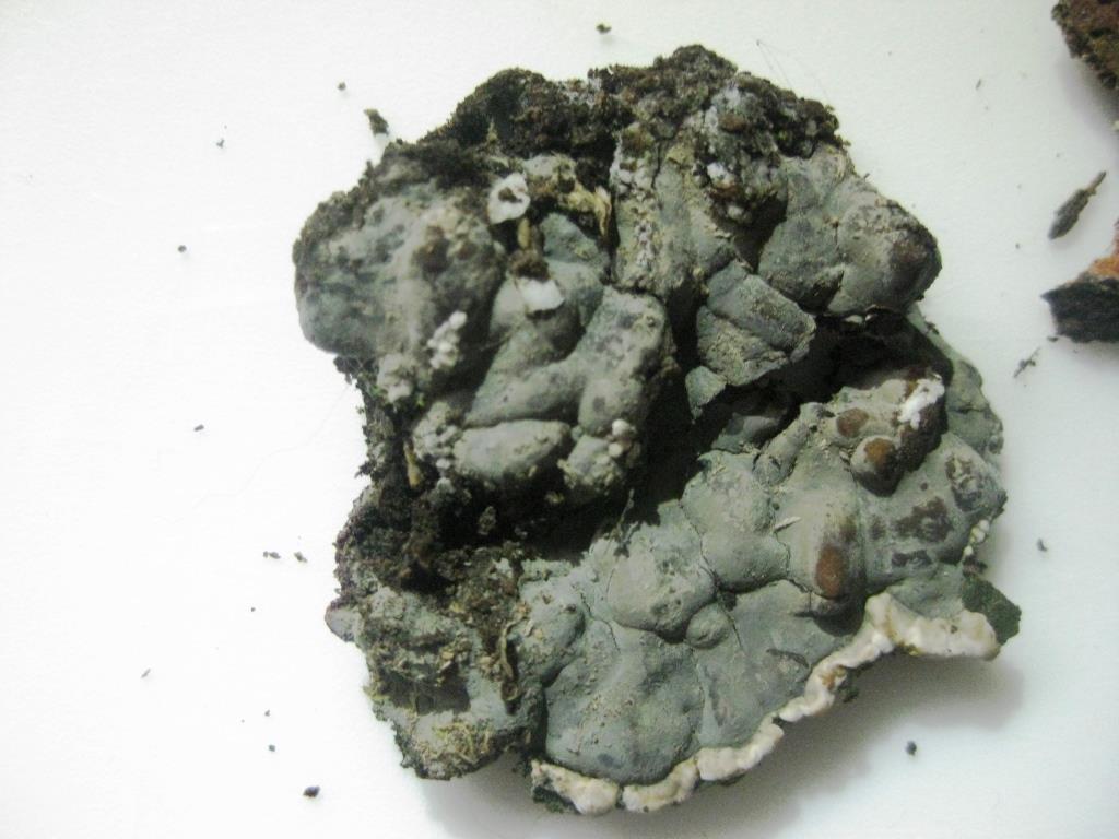 ich gehe davon aus, dass ich heute bei einem Spaziergang mit unserem Hund im Pasinger Stadtpark (bei München), Kretzschmaria deusta den Brandkohlekrustenpilz gefunden habe. Es dauerte etwas, bis ich diesen erkannte, da keinerlei von den schwarzen–œ Knubbeln–œ vorhanden waren, also sämtliche Fruchtkörper von den Konidien grau bestäubt waren (siehe Foto). Leider hatte ich keinen Fotoapparat dabei, so dass ich nur einen Fruchtkörper mitnehmen konnte, um diesen daheim zu fotografieren. Ich hatte dann noch vom Fruchtkörper die obere Schicht (wohl alles Konidien?) abgeschabt und mit dem Mikroskop angeschaut (siehe Fotos).