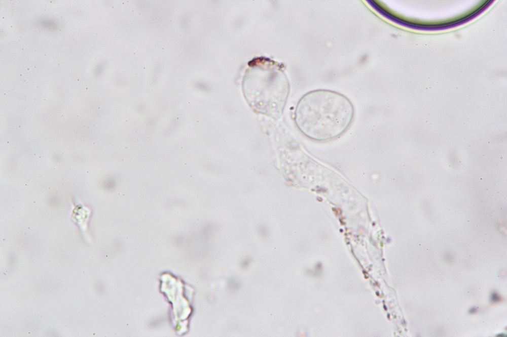 Es handelt sich um eine noch Unbekannten Entomophthorales-Art, deren Gattung man wohl nur per Sequenzierung herausfinden könnte (falls es nicht überhaupt eine neue Gattung ist).