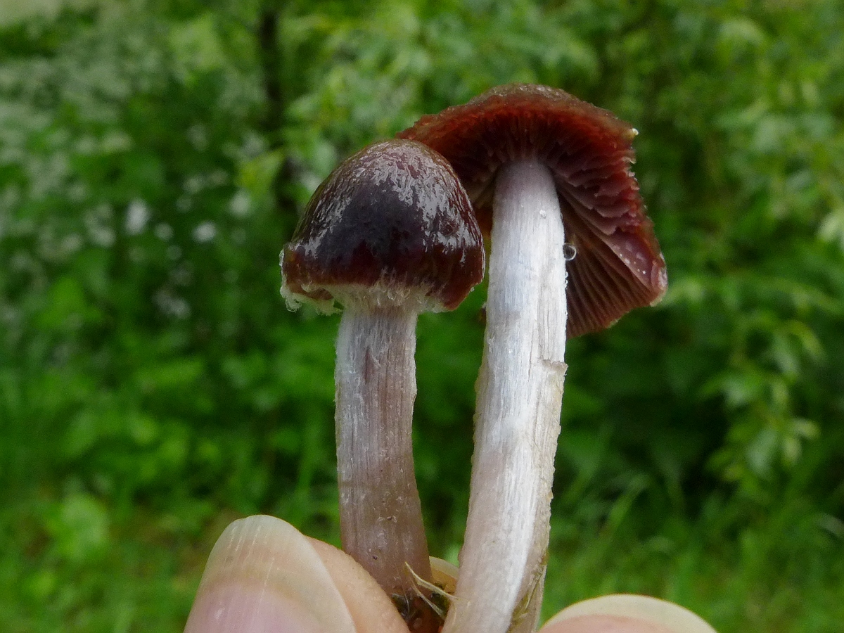 Huthaut nass glänzend, gestreift, in der Mitte heller, kleinster Pilz mit deutlichem weißen Velum