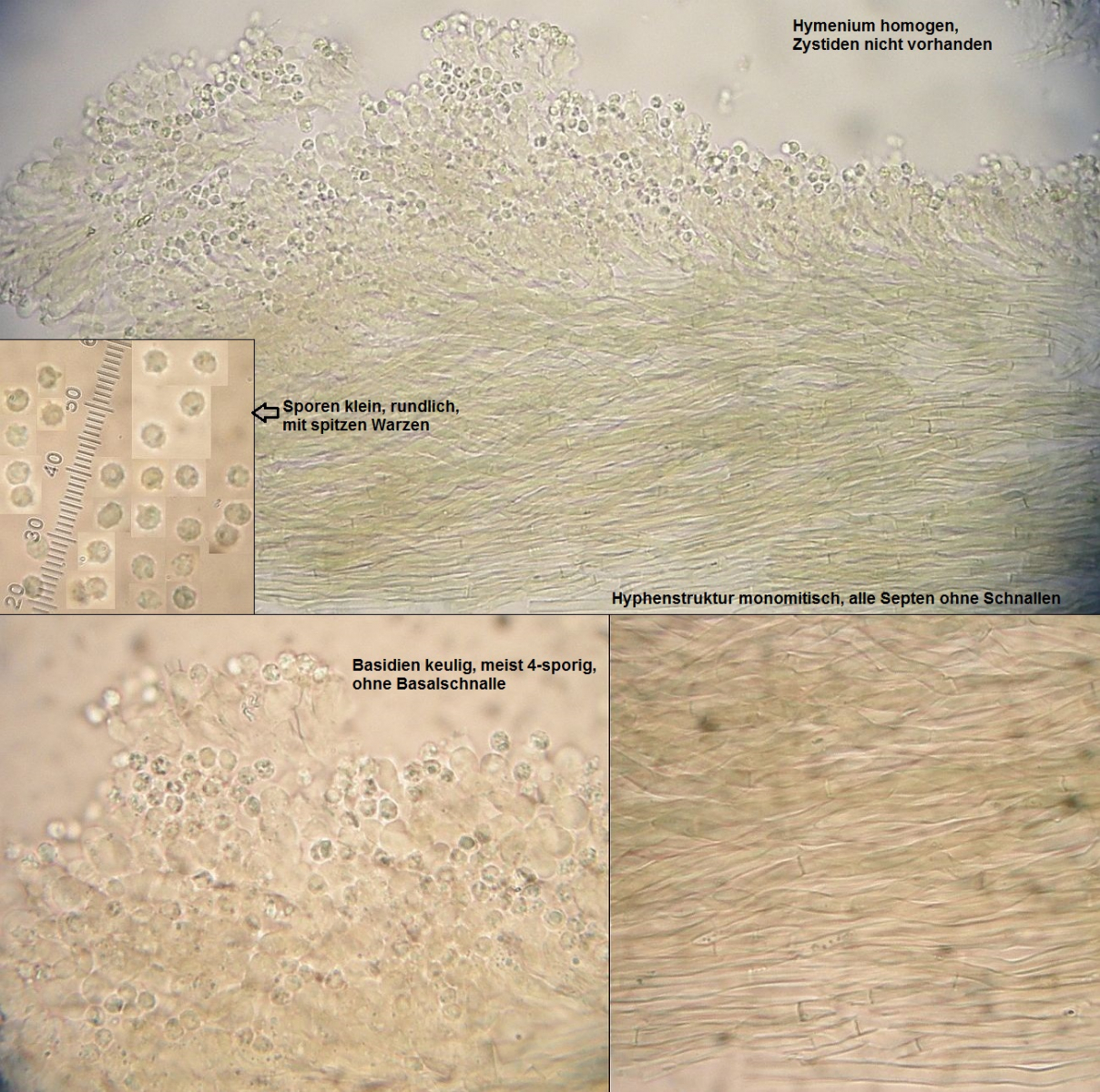 Sporen ellipsoid , hyalin 3,5 - 5 x 3 - 4 , Basidien keulig , 4 sporig 25 - 40 x 5 - 7 . Hyphenstruktur monomitisch , generative Hyphen 2,5 - 5 breit .