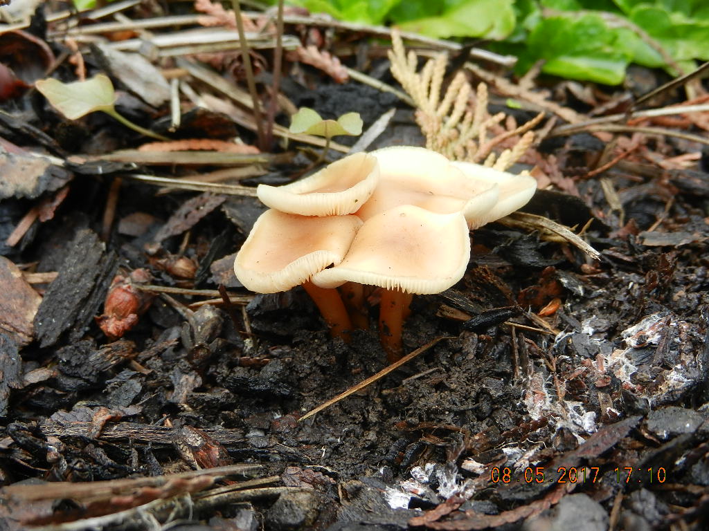 ebenfalls auf Mulch: Gymnopus dryophilus (Waldfreundrübling i. w. S.), nicht nach Kohl riechend und Lamellen ohne Gelb-Anflug
