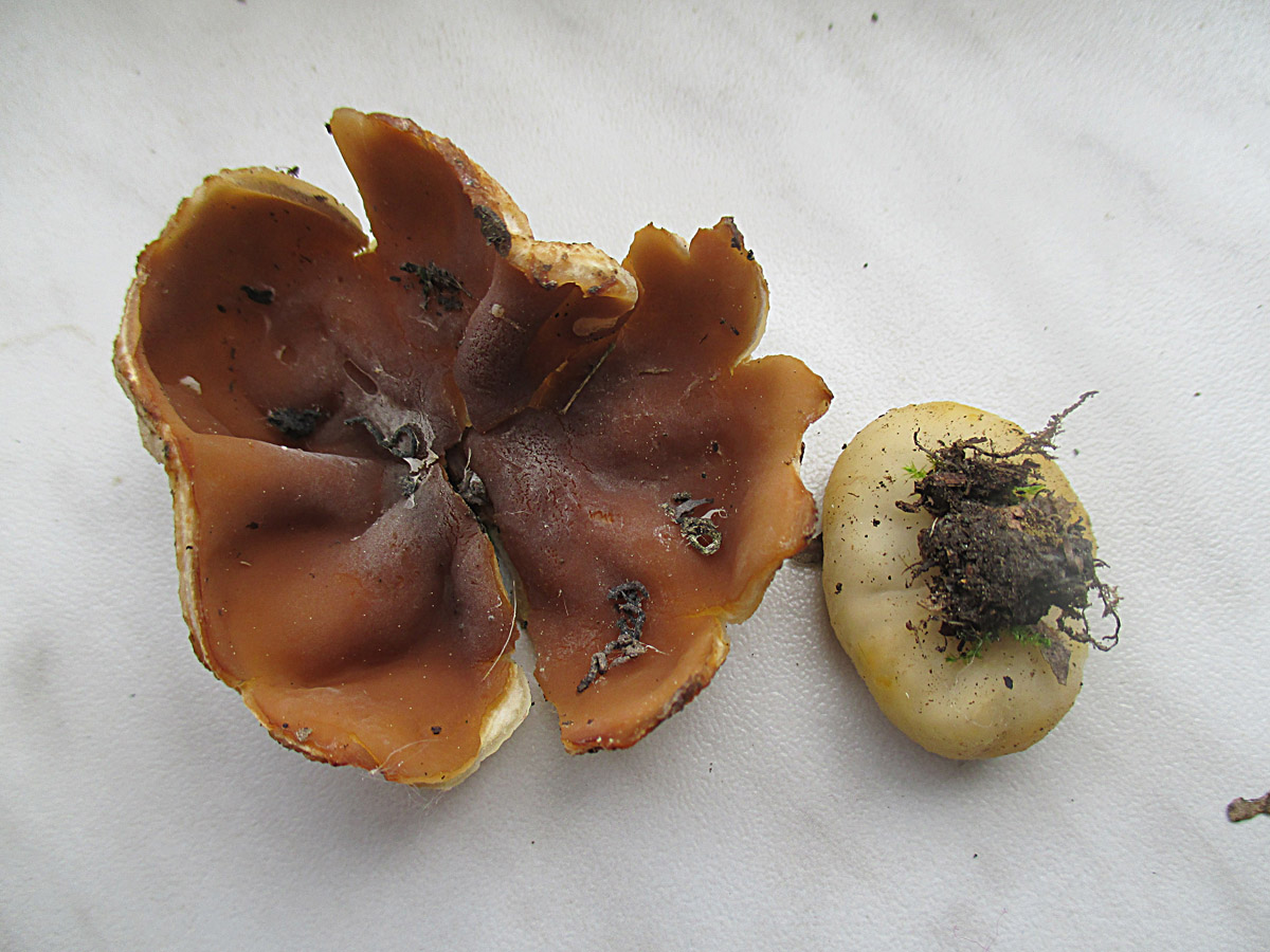 mir sind heute beim Spaziergang dies Becherlinge begegnet. Fundort war ein Wegrand auf dem Boden. Begleitbäume sind Ahorn, Hainbuche und Eiche. Das große exemplar ist 5 cm im Durchmesser, außen beigee, innen haselnussfarben.